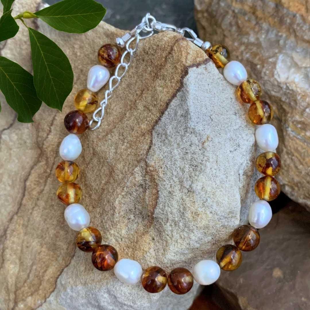 Bring warmth and elegance to your look with our Amber and Pearl Beaded Bracelet. This beautiful design alternates smooth round amber beads with lustrous freshwater pearls, creating a timeless blend of golden glow and soft iridescence. Finished with sterling silver beads and a secure lobster clasp, this bracelet is perfect for everyday wear or special occasions. Pearl, the birthstone for June, symbolizes purity and grace, while amber—formed from ancient fossilized tree resin—is cherished for its warm tones and natural, organic beauty.
