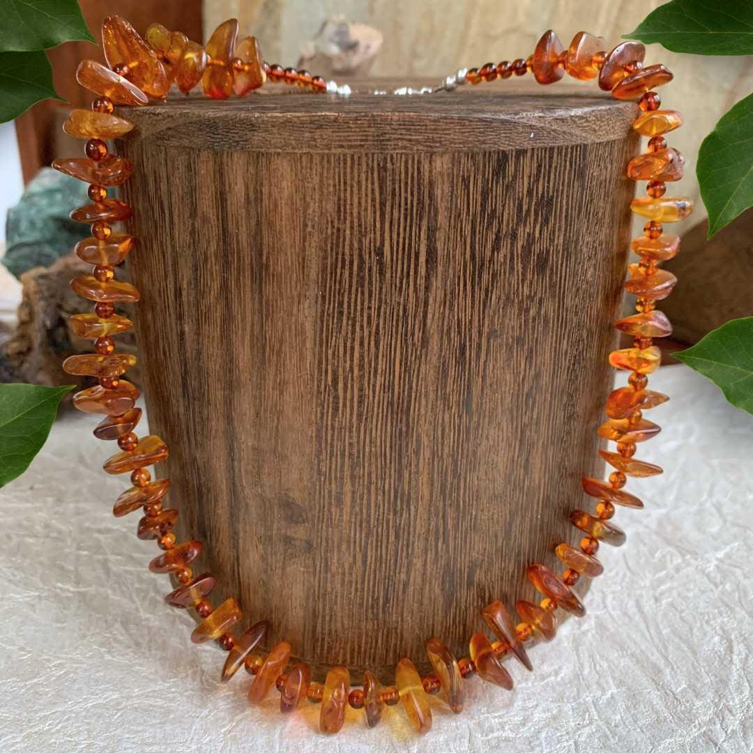Amber is an ancient, fossilized tree resin cherished for thousands of years for its warm hues, lightweight feel, and natural inclusions that make every bead unique. This necklace highlights the beauty of genuine amber and adds a touch of earthy elegance to any outfit.