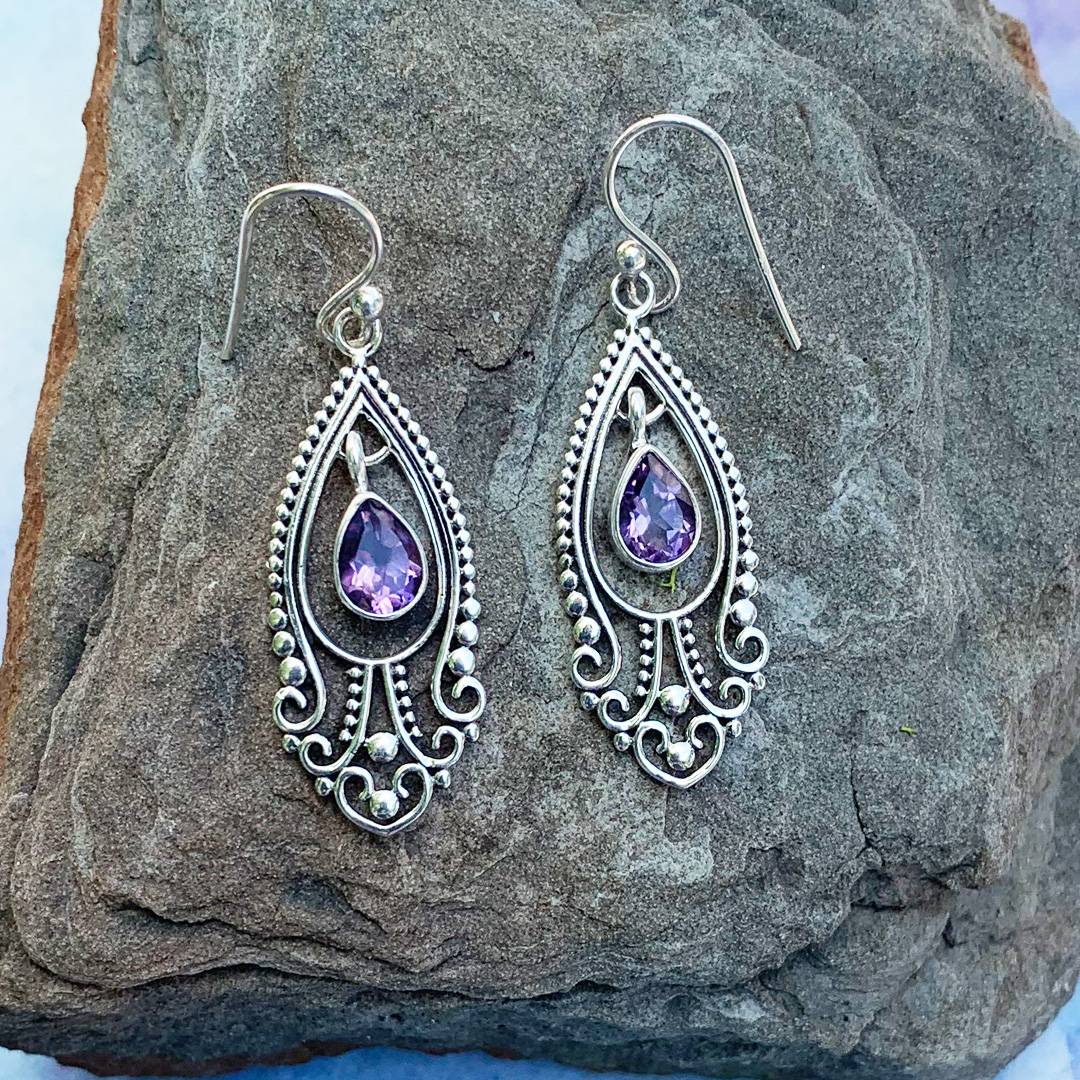Beautiful purple stones with a center drop are magical in these Amethyst Drop & Silver Earrings. Surrounded by alluring Sterling Silver detail. This pair is for that feminine girl.