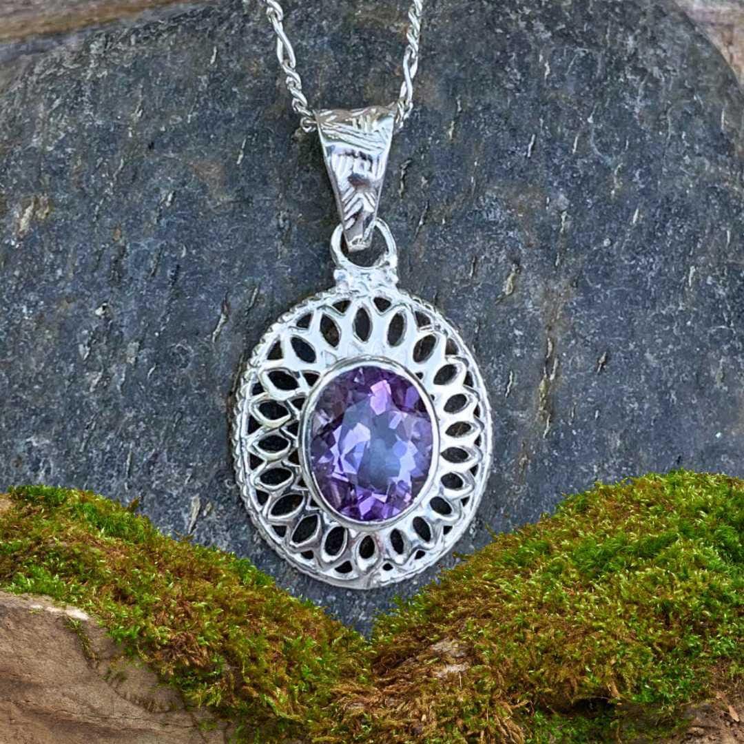 Our Amethyst Sterling Silver Pendant combines elegance and meaning in a timeless design. At its center sits a beautiful oval faceted amethyst gemstone, surrounded by an ornate frame of filigree sterling silver that enhances the gem’s natural sparkle. The intricate silverwork adds a touch of vintage charm, while the faceted amethyst catches the light with every movement.