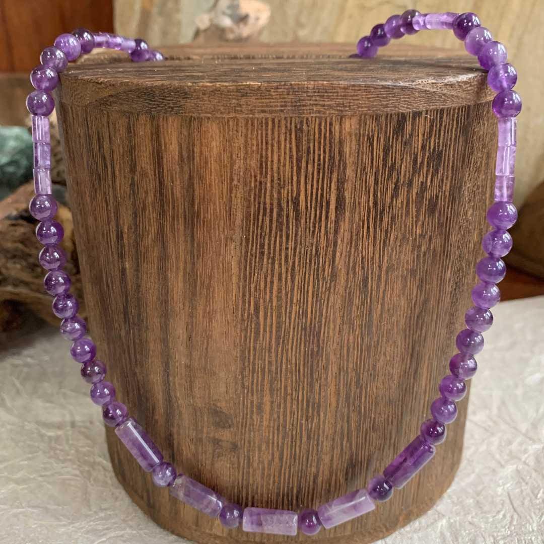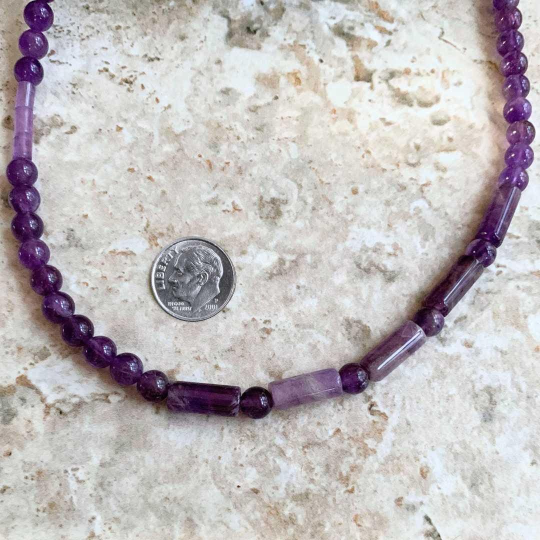 Our Amethyst Tubes and Round Beads Necklace features a beautiful mix of sleek amethyst tube beads paired with smooth round amethyst beads, creating a balanced and eye-catching design. The rich purple hues of natural amethyst add a touch of elegance and sophistication to any outfit. Finished with sterling silver beads and a secure sterling silver lobster clasp, this handcrafted necklace measures 19.5 inches and includes a 1.5-inch extension chain for an adjustable, comfortable fit.