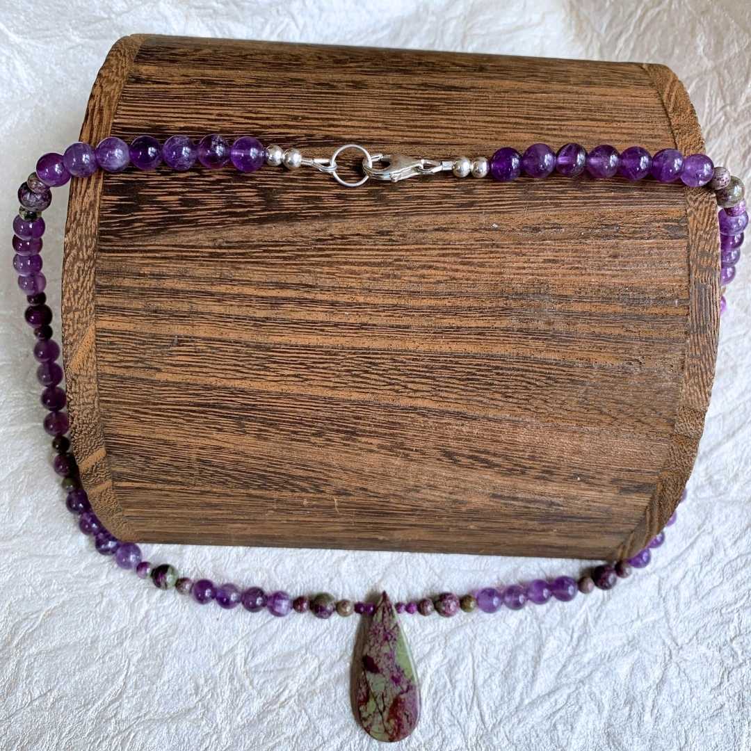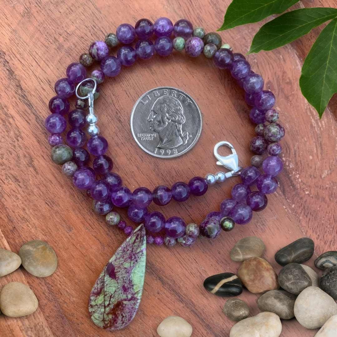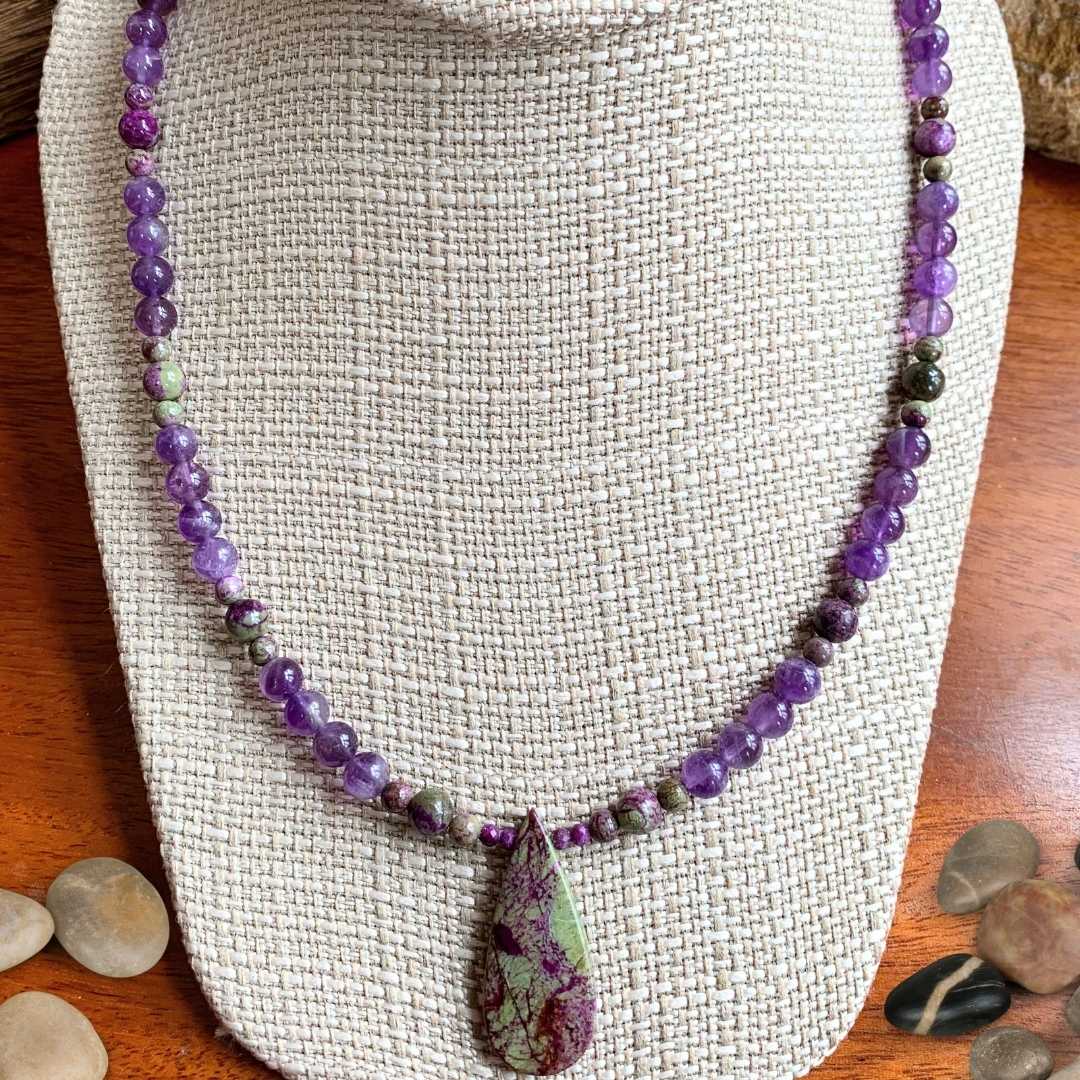 Our Atlantisite Stichtite and Amethyst Necklace features a striking teardrop-shaped Atlantisite Stichtite pendant as its beautiful focal point. Rich purple amethyst beads extend up the necklace, accented by smaller round Atlantisite Stichtite beads for a unique blend of color and natural stone patterns. Atlantisite is a rare gemstone found in Tasmania, formed from the combination of serpentine and stichtite, and is admired for its muted green and purple and fuchsia hues as well as its association with balance and emotional harmony. Finished with sterling silver accent beads and a secure lobster clasp, this elegant gemstone necklace measures 19.5 inches long. Amethyst is February’s birthstone, making this necklace a meaningful gift for February birthdays or anyone who loves distinctive natural gemstone jewelry.