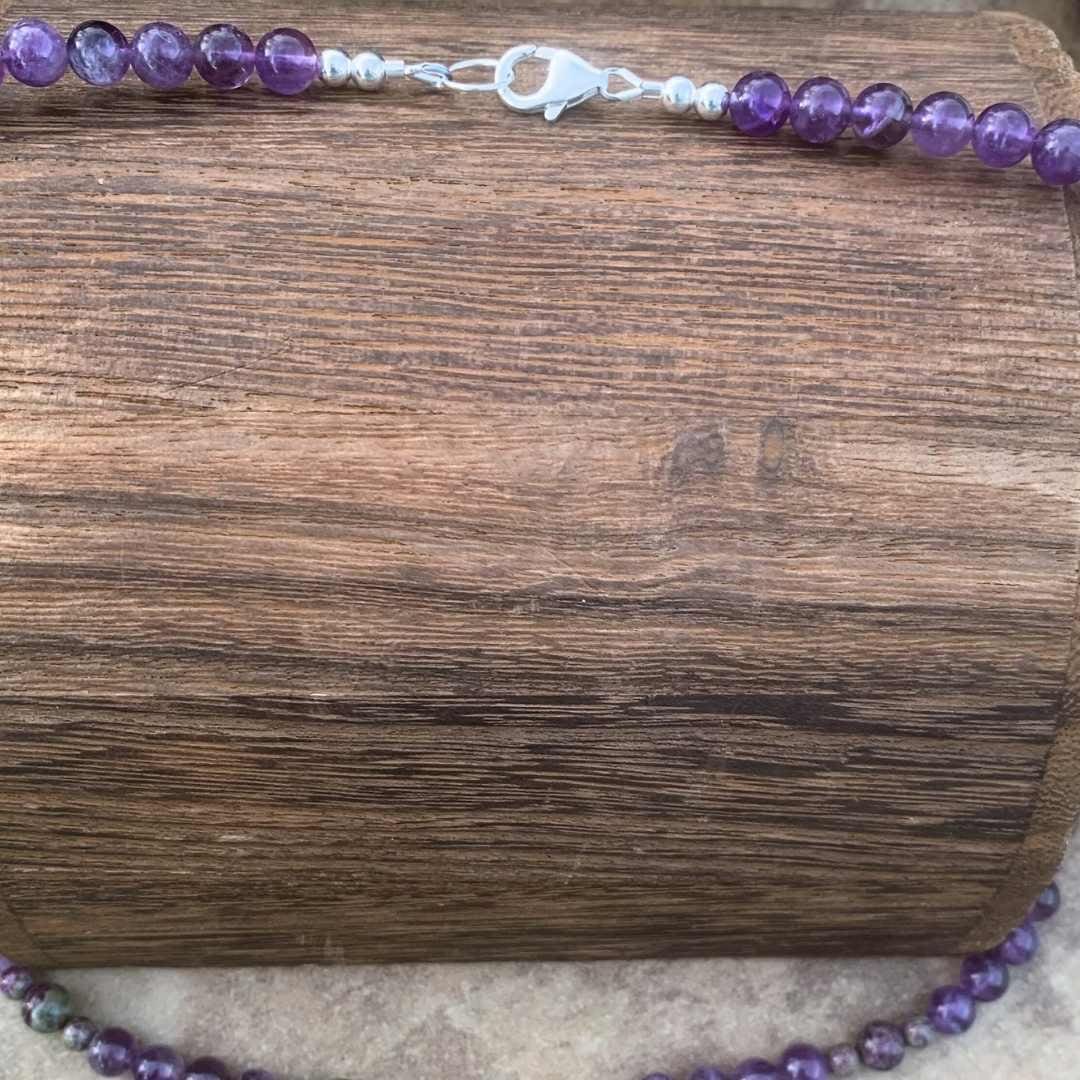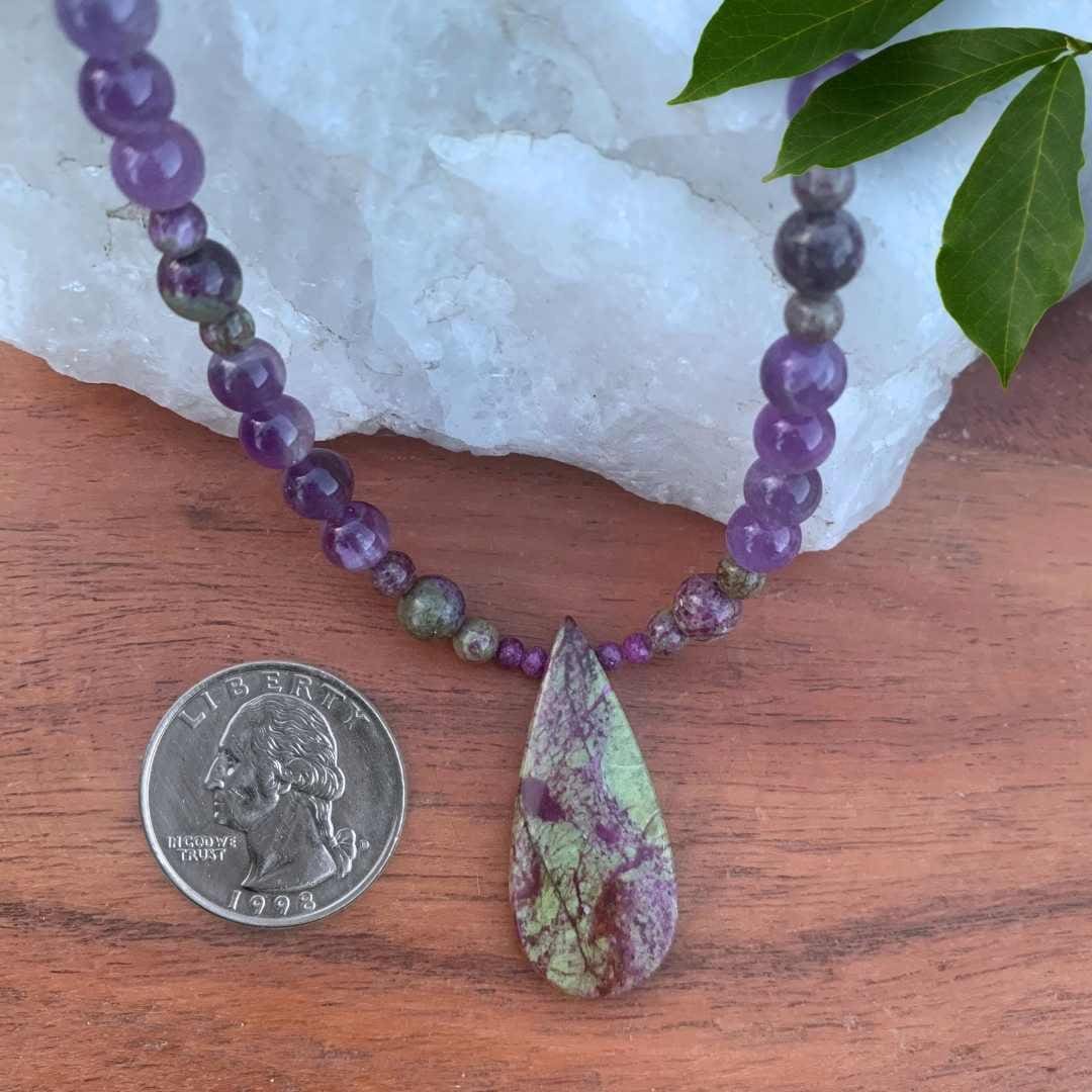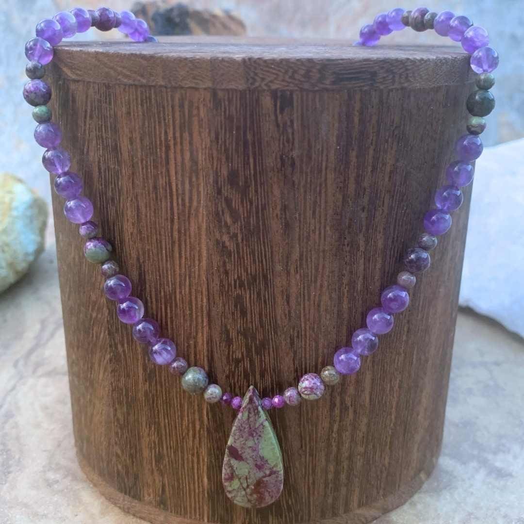 Our Atlantisite Stichtite and Amethyst Necklace features a striking teardrop-shaped Atlantisite Stichtite pendant as its beautiful focal point. Rich purple amethyst beads extend up the necklace, accented by smaller round Atlantisite Stichtite beads for a unique blend of color and natural stone patterns. Atlantisite is a rare gemstone found in Tasmania, formed from the combination of serpentine and stichtite, and is admired for its muted green and purple and fuchsia hues as well as its association with balance and emotional harmony. Finished with sterling silver accent beads and a secure lobster clasp, this elegant gemstone necklace measures 19.5 inches long. Amethyst is February’s birthstone, making this necklace a meaningful gift for February birthdays or anyone who loves distinctive natural gemstone jewelry.