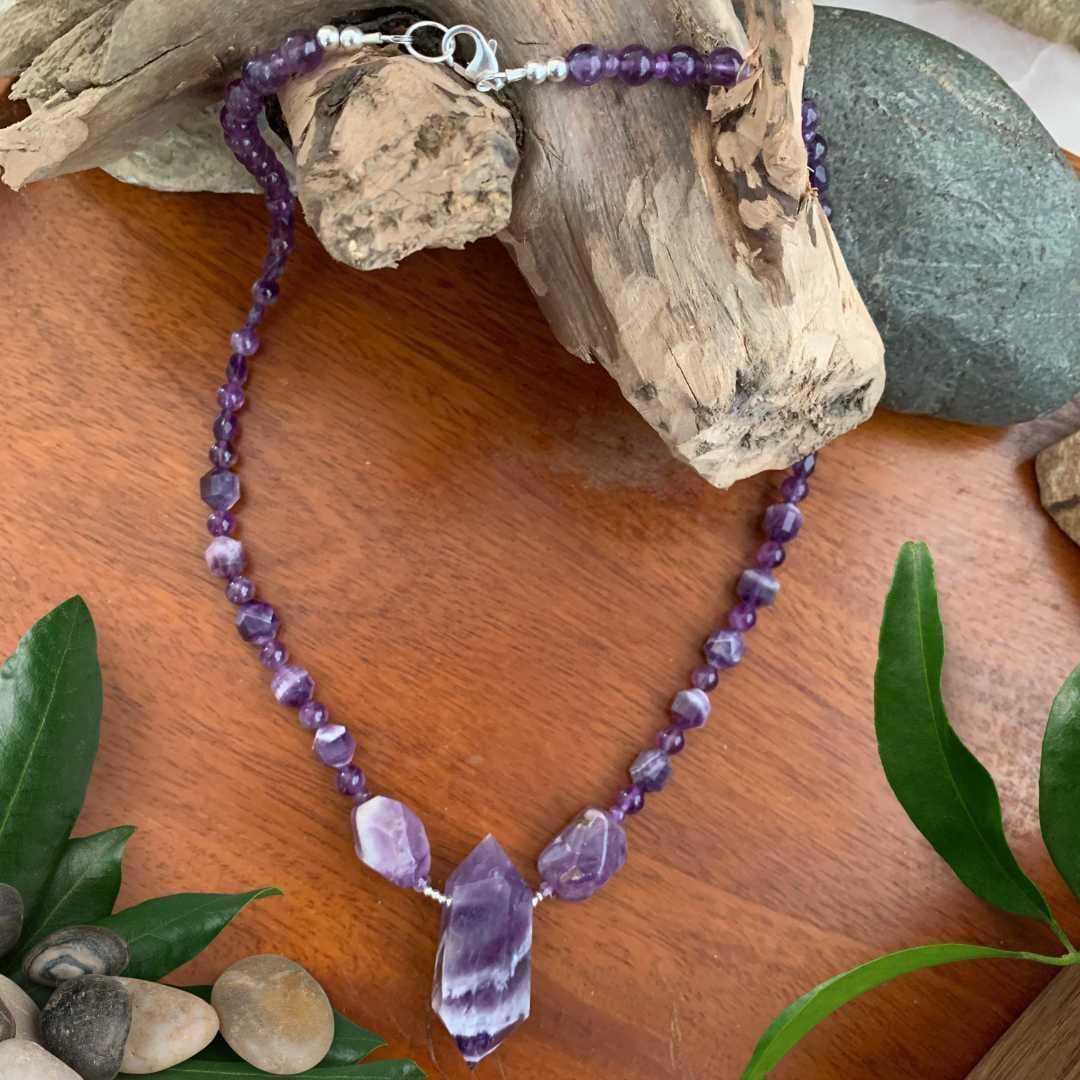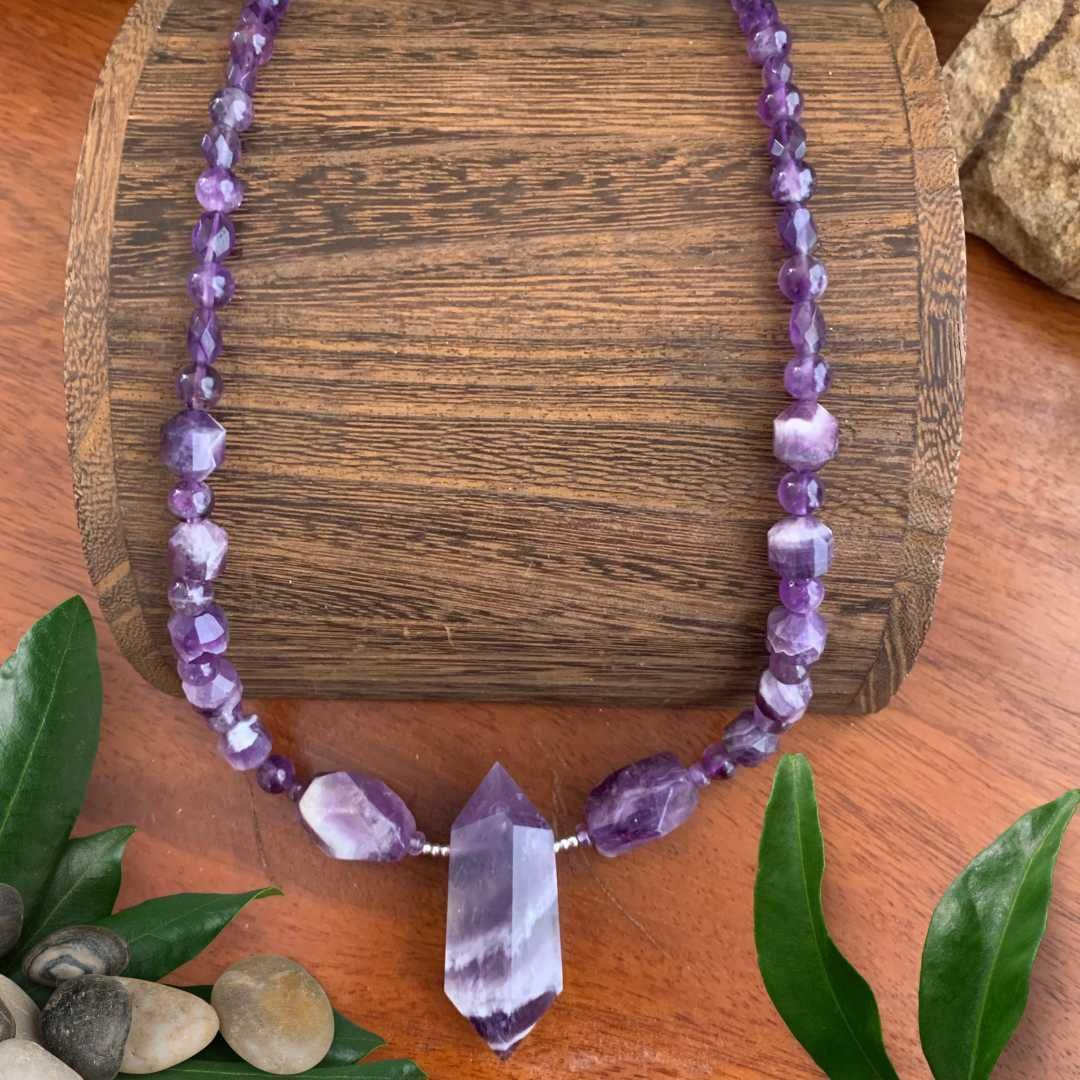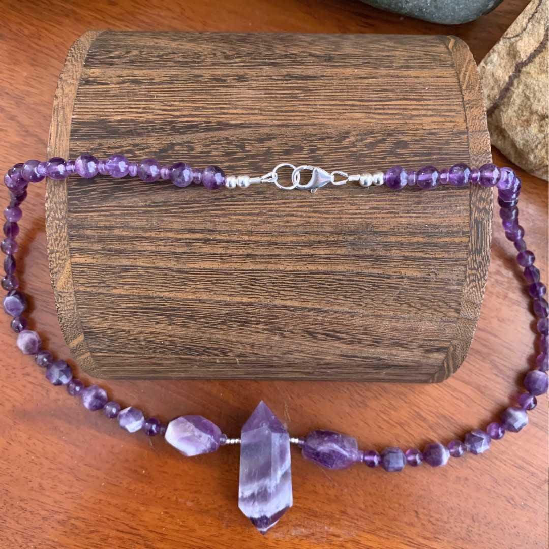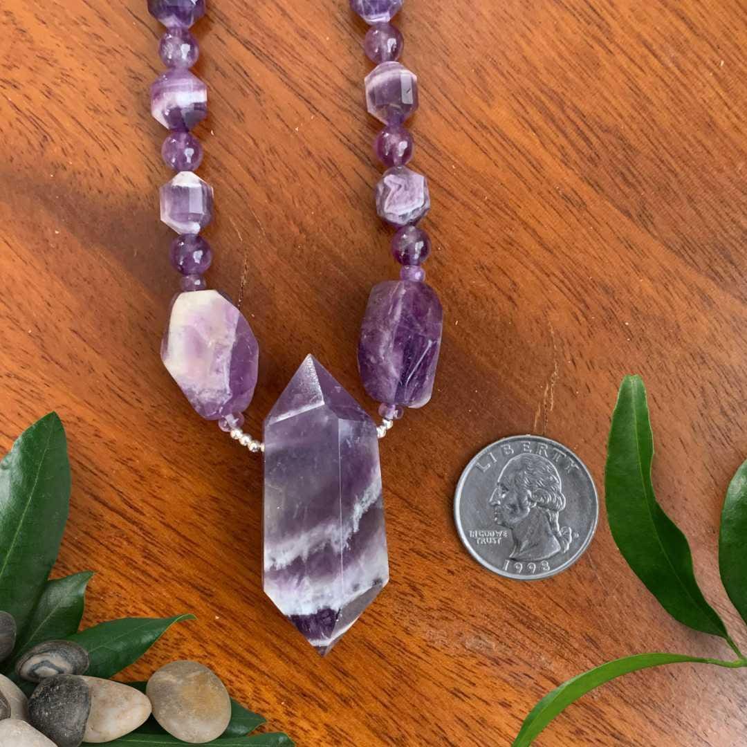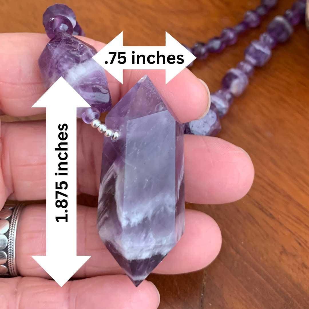 Our Chevron Amethyst Double Point Pendant and Beaded Necklace showcases a striking 1.875-inch long by .75-inch wide double point Chevron Amethyst pendulum-style pendant, accented with small sterling silver beads for added detail. Along the neckline, alternating faceted and smooth round amethyst beads create beautiful sparkle and dimension. The necklace is finished with sterling silver beads and a secure lobster clasp. It measures 23 inches long, with the pendant adding nearly an additional 1.5-inch drop when worn.
