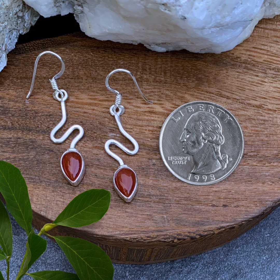 Add a modern flair to your jewelry collection with these Contemporary Sterling Silver and Carnelian Teardrop Earrings. With zig-zag sterling silver sections dropping down to carnelian teardrop shaped cabochons these earrings offer a nice bit of dangle and movement.