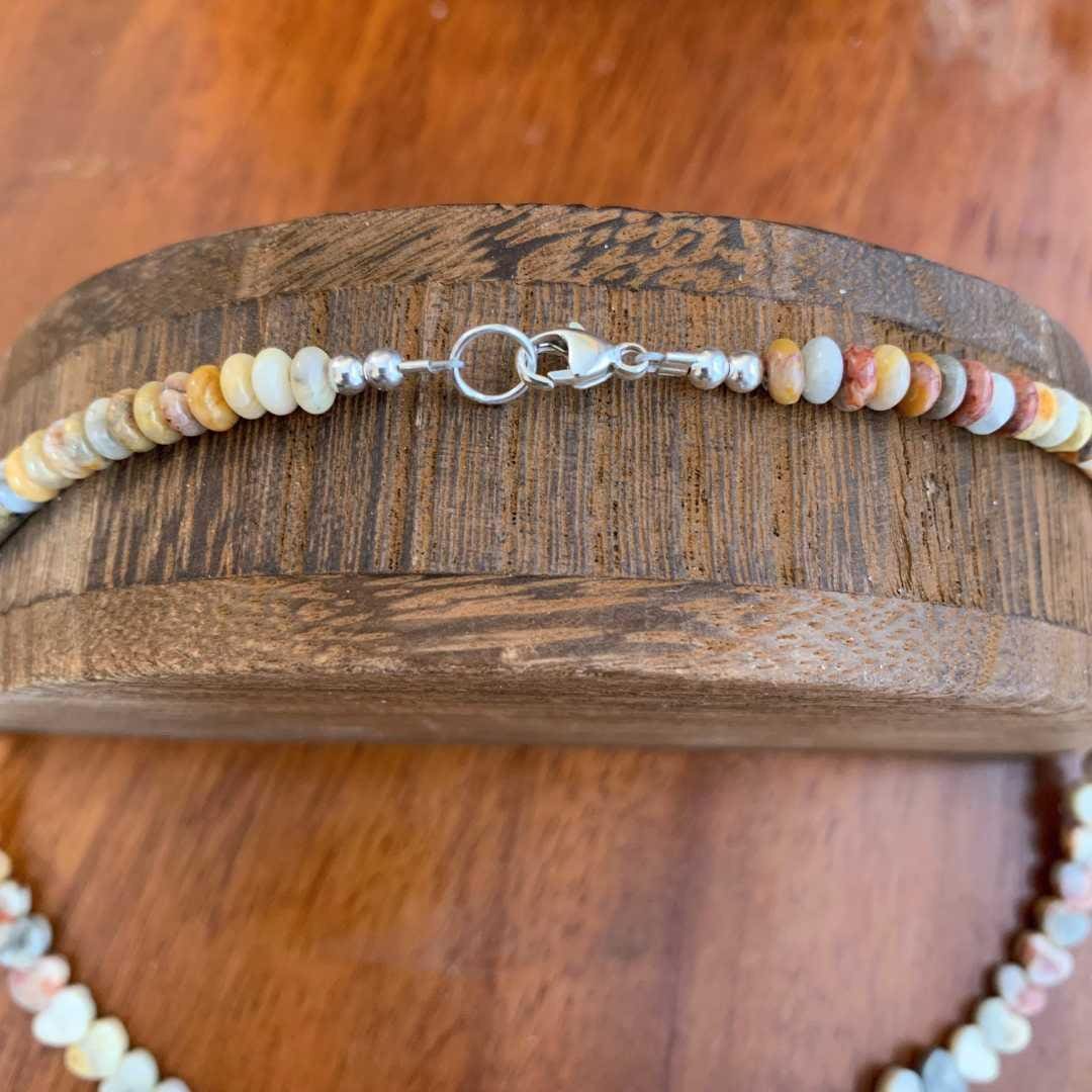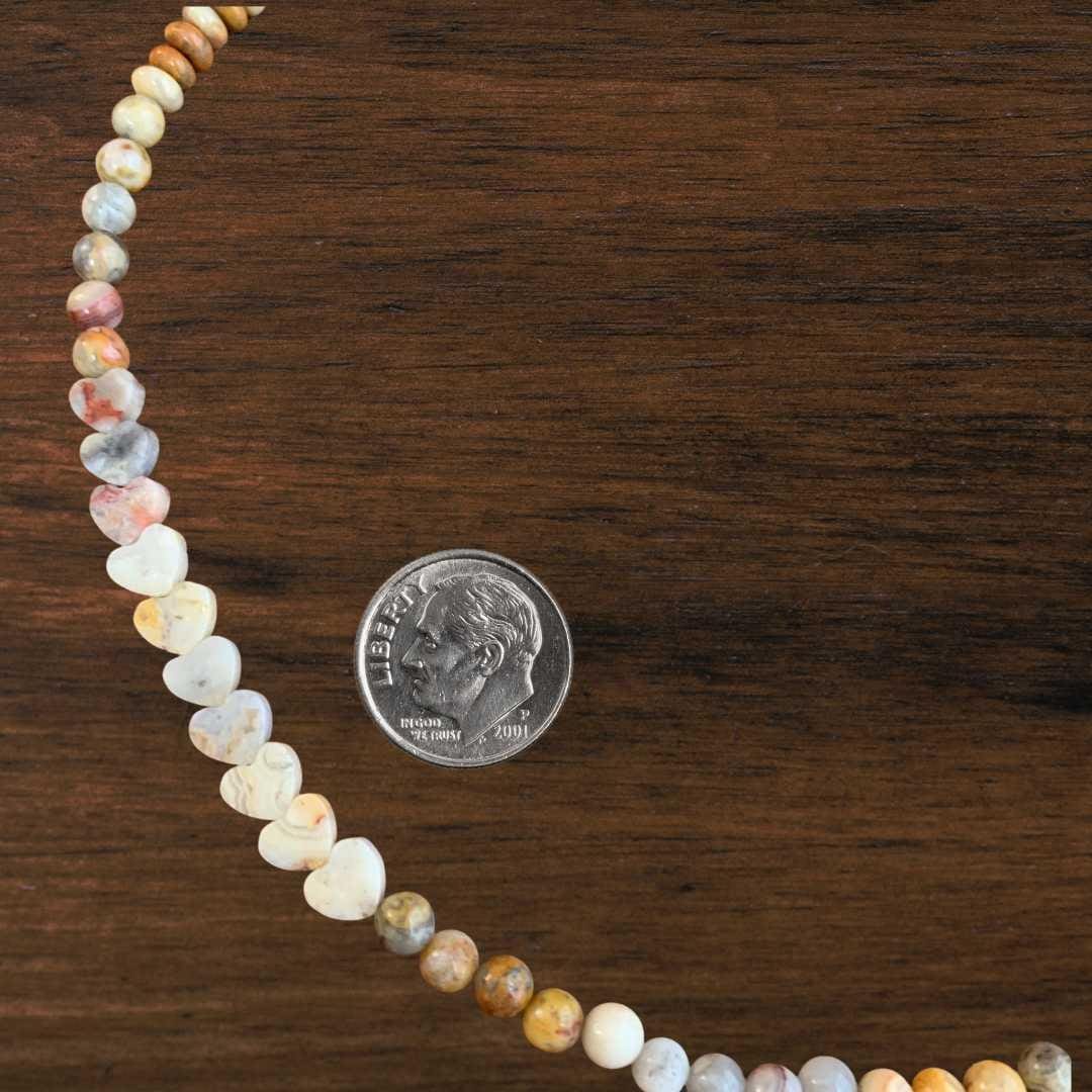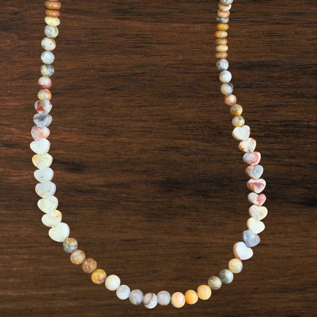 Add a playful yet earthy touch to your jewelry collection with our Crazy Lace Agate Hearts Choker Necklace. This natural stone choker features ten petite crazy lace agate heart beads on each side, accented with a mix of round, rondelle, and tube beads. This mixture creates beautiful texture and visual interest. Known as the “laughter stone,” crazy lace agate showcases swirling patterns and warm tones. No two stones are ever alike, making each necklace truly one of a kind. Finished with sterling silver beads and a secure lobster clasp, this 15.5-inch choker has a relaxed, organic look that’s perfect worn alone or layered with your favorite necklaces. A thoughtful Valentine’s Day gift or a meaningful piece for someone you love.