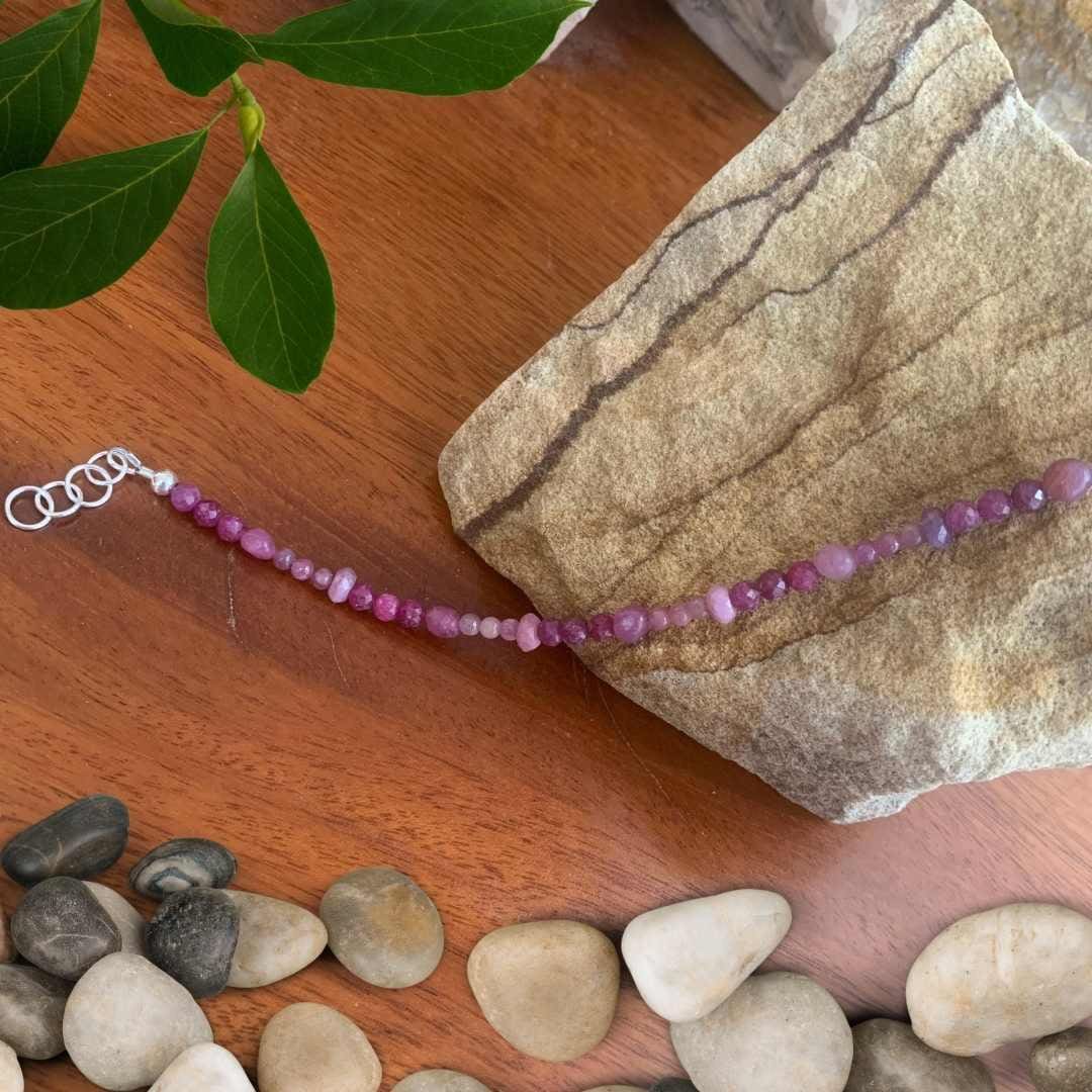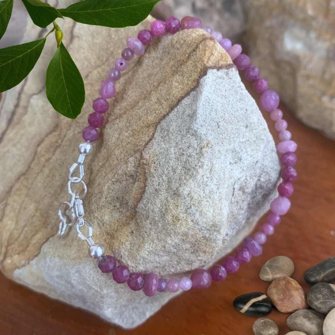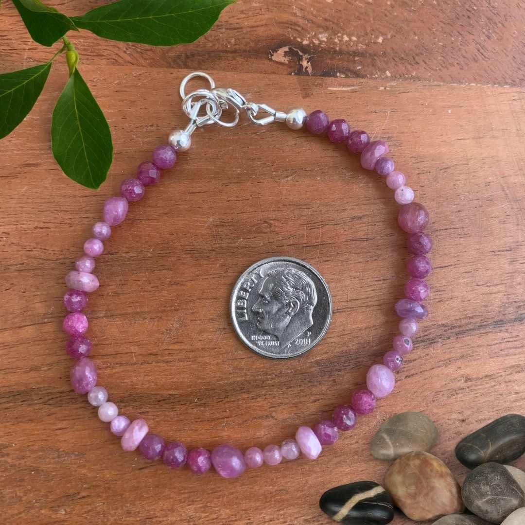 Our Dainty Mixed Ruby Beaded Bracelet showcases the pinker shades of natural rubies in a delicate design. The bracelet features an assortment of smooth and faceted round ruby beads accented with sparkling faceted rondelles and small natural ruby nuggets for added texture. Finished with sterling silver accent beads and a secure lobster clasp, this gemstone bracelet is perfect for everyday wear. Ruby is the birthstone for July, making this sterling silver and ruby bracelet a meaningful gift for July birthdays.