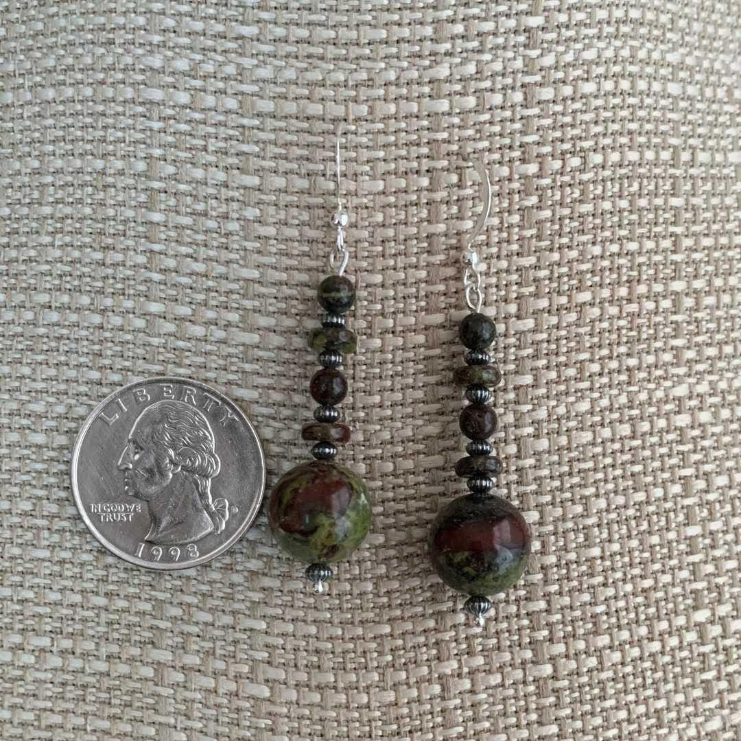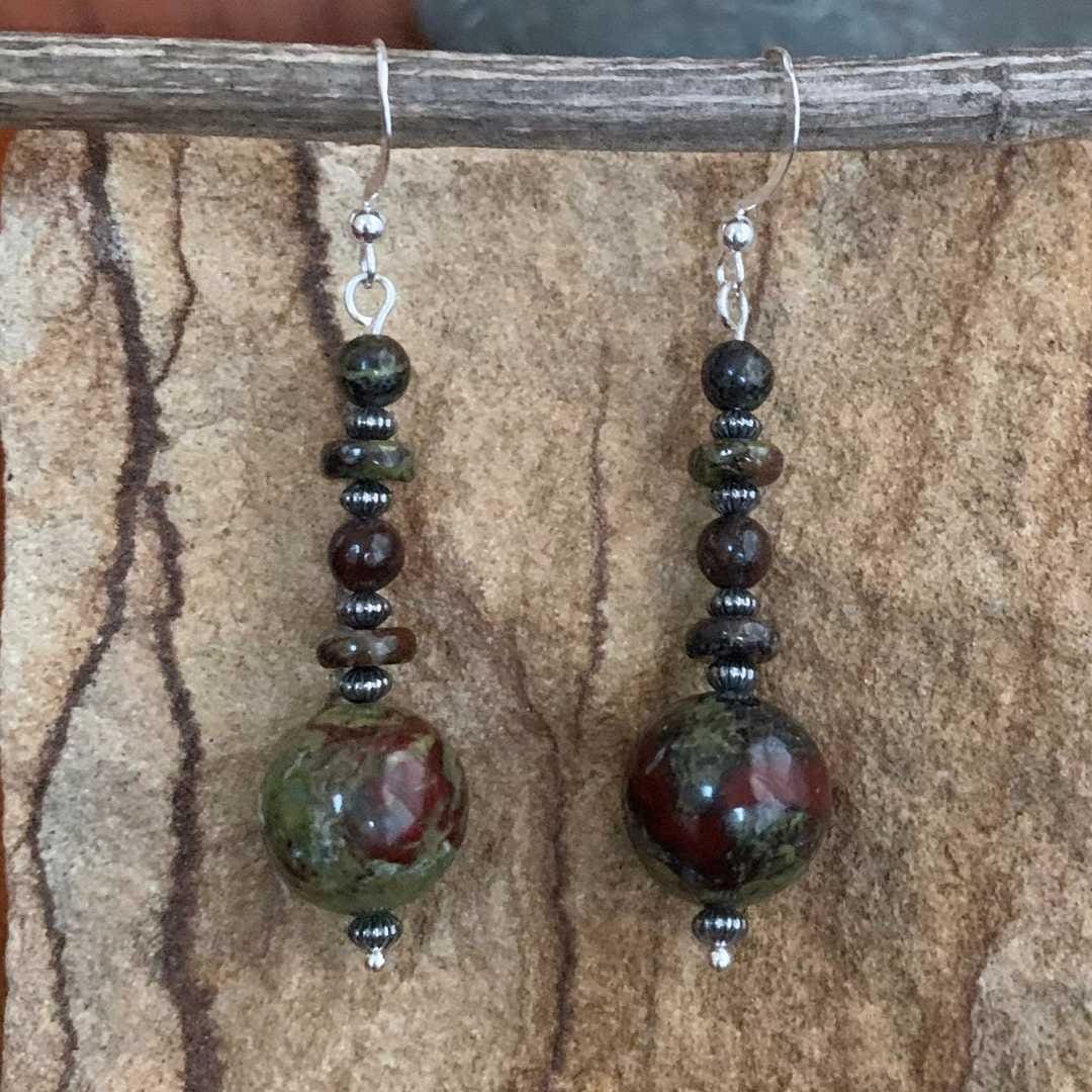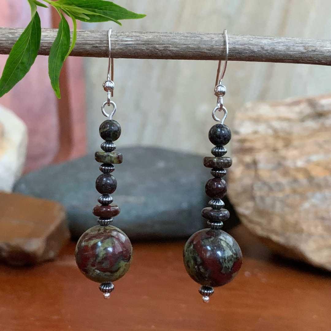 Make a bold, earthy statement with our Dragon Blood Jasper and Sterling Silver Earrings. Each earring features a large smooth round Dragon Blood Jasper bead, accented by alternating rondelle and small round beads, all separated by oxidized sterling silver spacers for added texture and depth. Known for its striking mix of deep green and rich red tones, Dragon Blood Jasper is often associated with strength, courage, and vitality. Finished with sterling silver ear wires, these earrings offer a beautiful, eye-catching dangle perfect for everyday wear or special occasions.