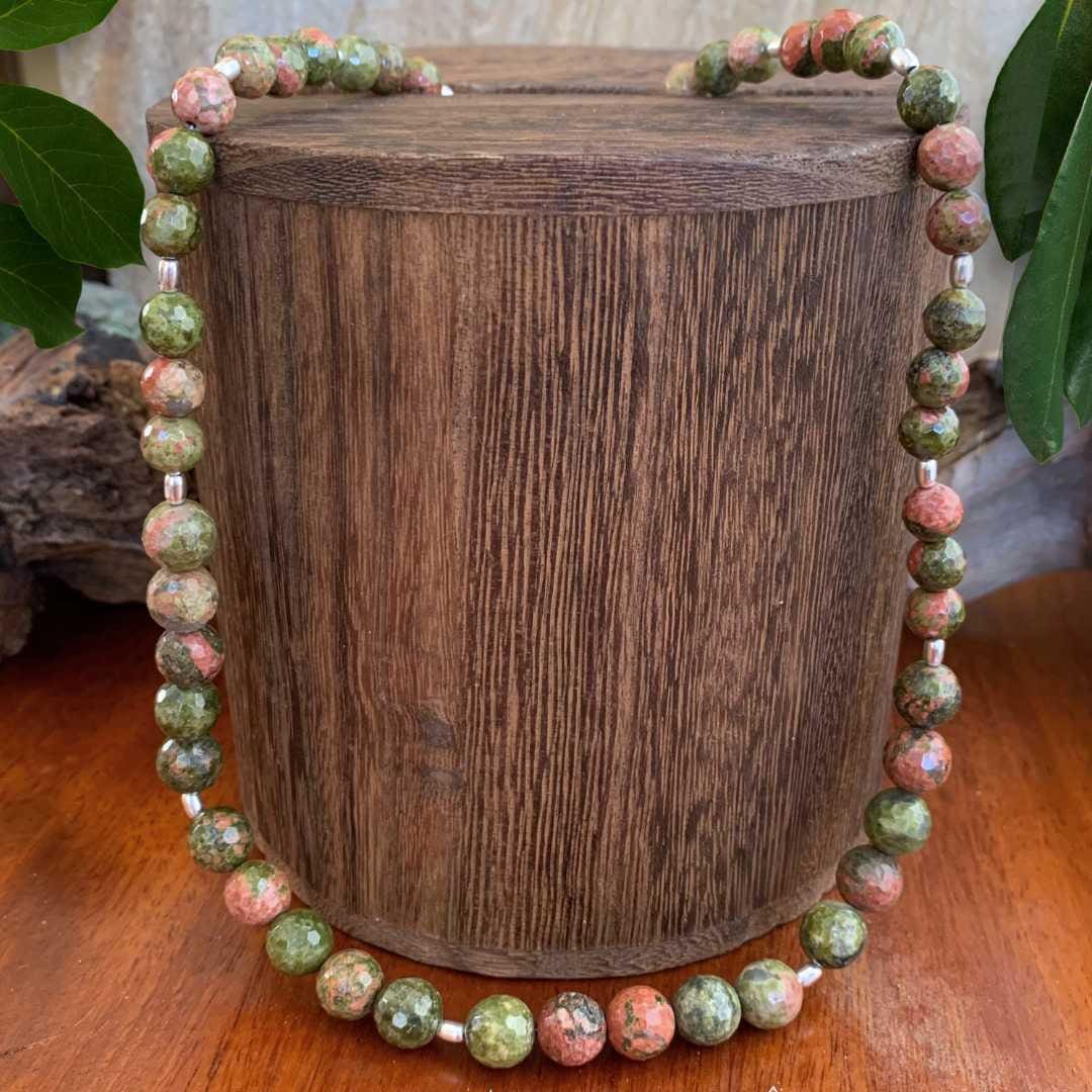 Unakite is known for its unique blend of earthy olive greens and warm peachy-salmon tones. They create a natural mosaic of color in every bead and are  often associated with balance, grounding, and emotional healing.  Unakite is a favorite among those who appreciate meaningful gemstones and organic beauty. This unakite and sterling silver necklace adds a touch of nature-inspired elegance to any jewelry collection
