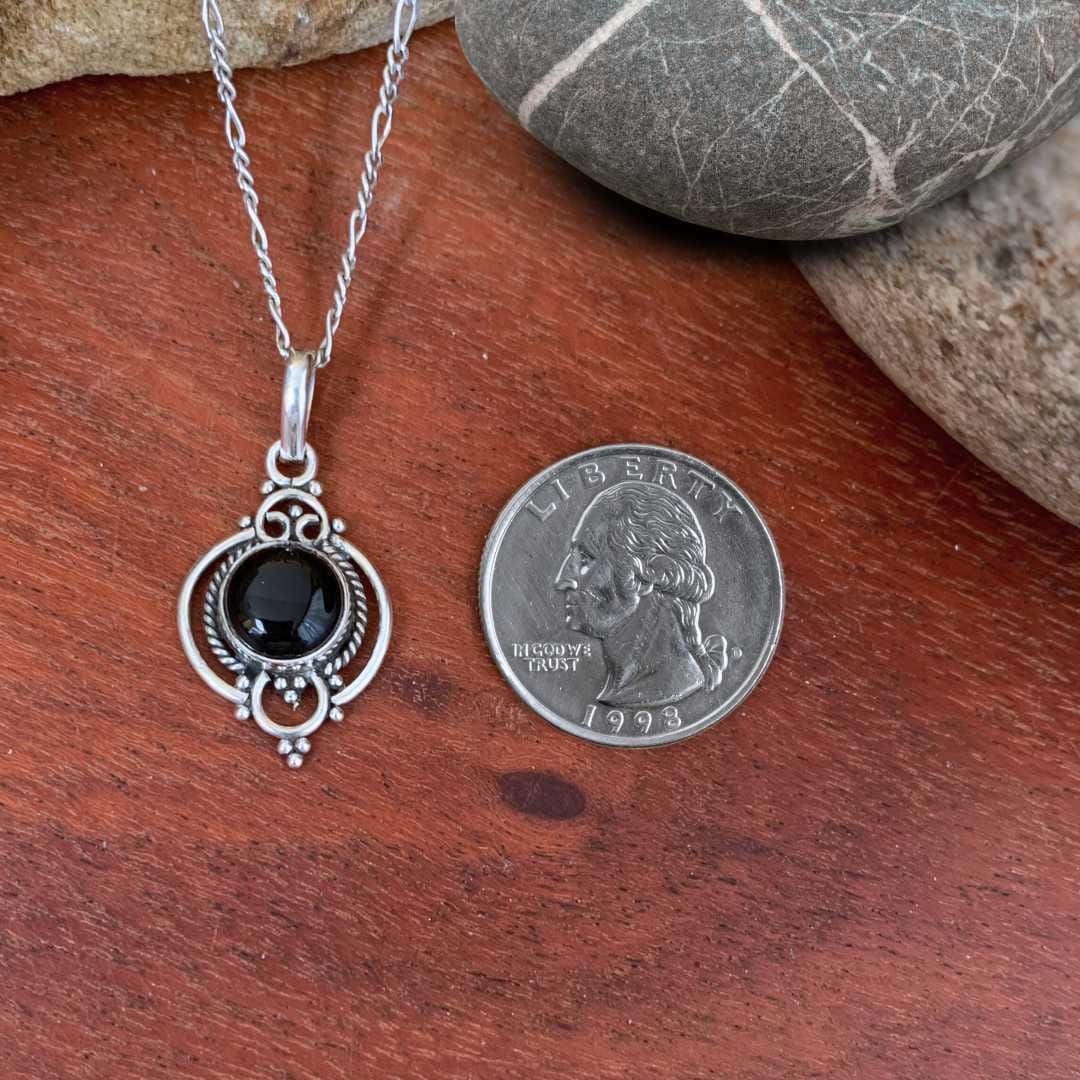 Our Feminine Black Onyx and Sterling Silver Pendant showcases the bold elegance of a polished round black onyx gemstone set at the center. Surrounding the stone is intricate sterling silver filigree accented with delicate beadwork, creating a refined and feminine design. The deep, rich black of onyx contrasts beautifully with the bright shine of sterling silver, making this pendant a versatile accessory that pairs effortlessly with both casual and dressy looks. Known as a stone of strength and protection, black onyx adds meaning as well as timeless style. A perfect gift or personal treasure, this sterling silver pendant is a classic addition to any jewelry collection.