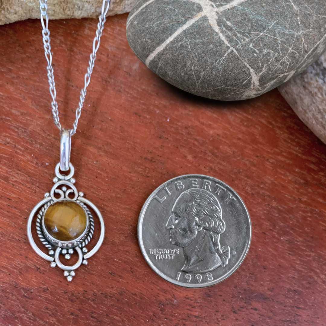 Our Feminine Tiger’s Eye and Sterling Silver Pendant beautifully combines earthy elegance with timeless craftsmanship. A polished round tiger’s eye gemstone sits at the center, radiating warm golden-brown hues with its signature chatoyant glow. Surrounding the stone is open sterling silver accented with delicate beadwork, adding a refined yet feminine touch. Known as a stone of strength and confidence, tiger’s eye makes this pendant not only a stylish accessory but also a meaningful piece of gemstone jewelry. Perfect for everyday wear or as a thoughtful gift, this sterling silver tiger’s eye pendant brings natural beauty and sophistication to any collection.