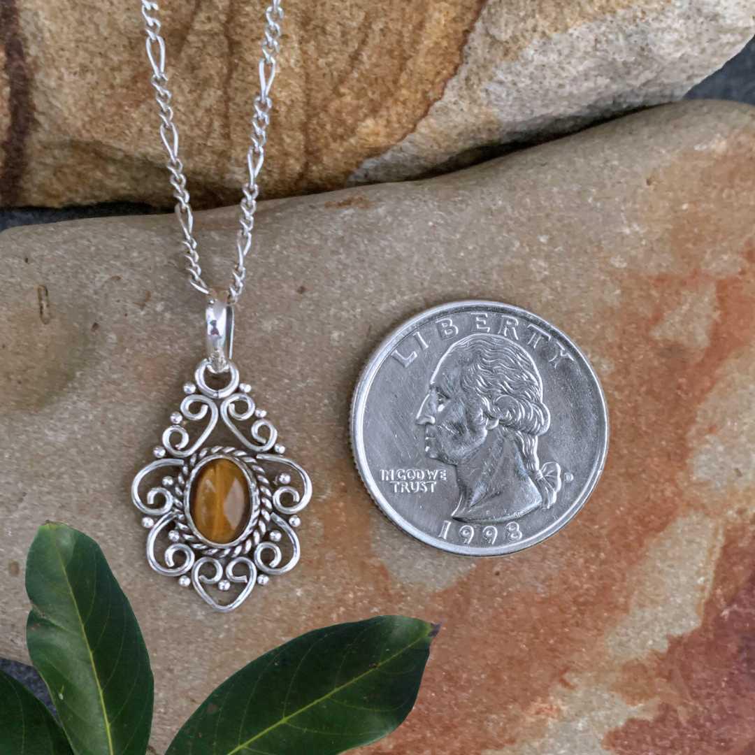 Our Filigree Sterling Silver and Tiger’s Eye Pendant is a delicate and feminine piece that beautifully pairs intricate silver filigree with the warm, golden-brown glow of tiger’s eye. The elegant design highlights the gemstone’s natural chatoyancy, creating a pendant that is both sophisticated and eye-catching.