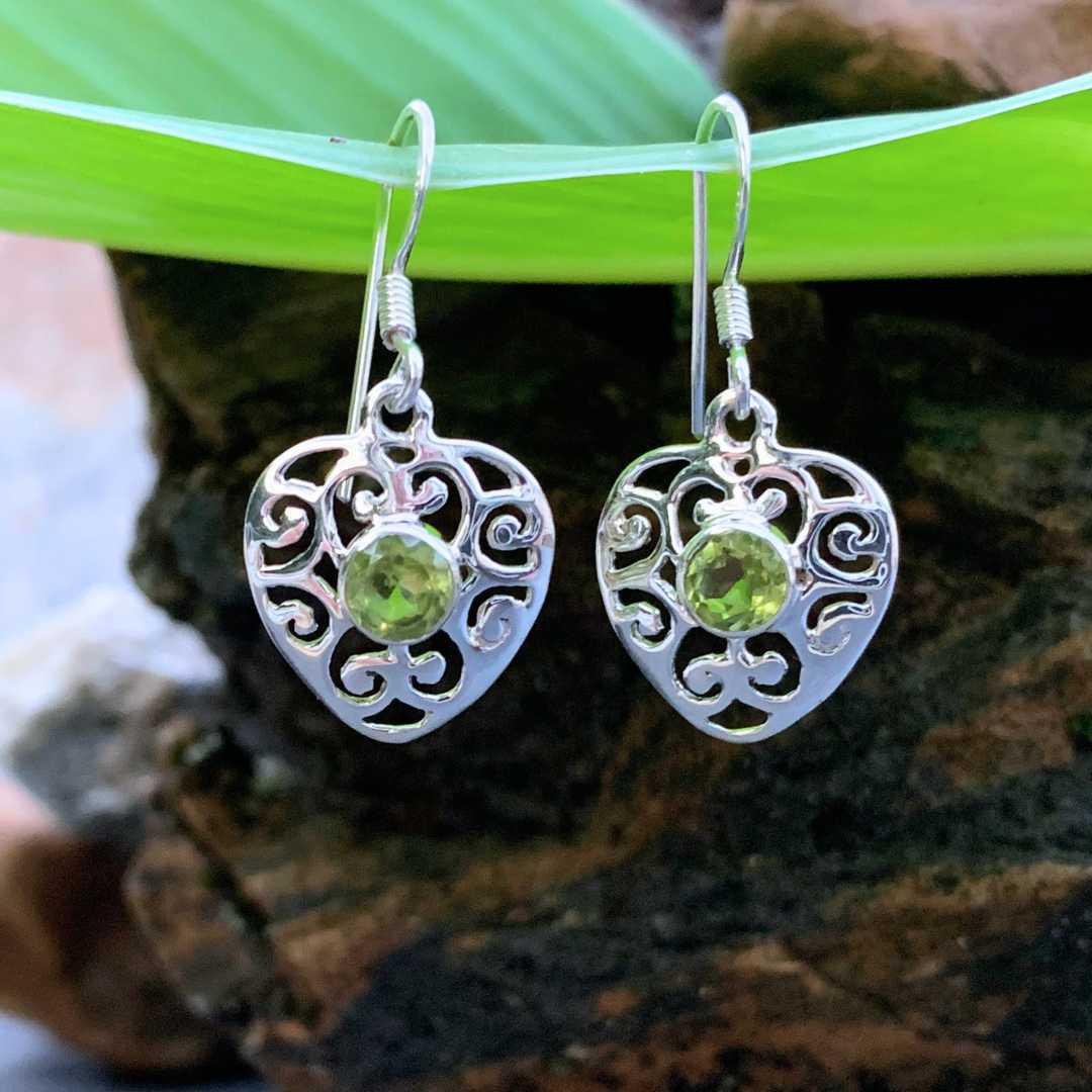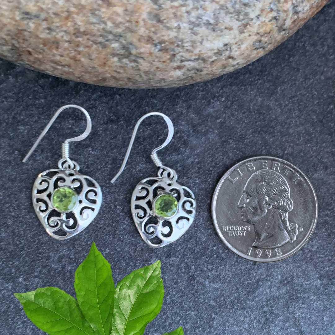 Add a touch of romance with our Filigree Sterling Silver Peridot Heart Earrings. These lovely earrings feature heart-shaped designs accented with faceted peridot stones and intricate sterling silver filigree for vintage-inspired charm. A beautiful gift for August birthdays, anniversaries, or anyone who loves heartfelt sparkle.