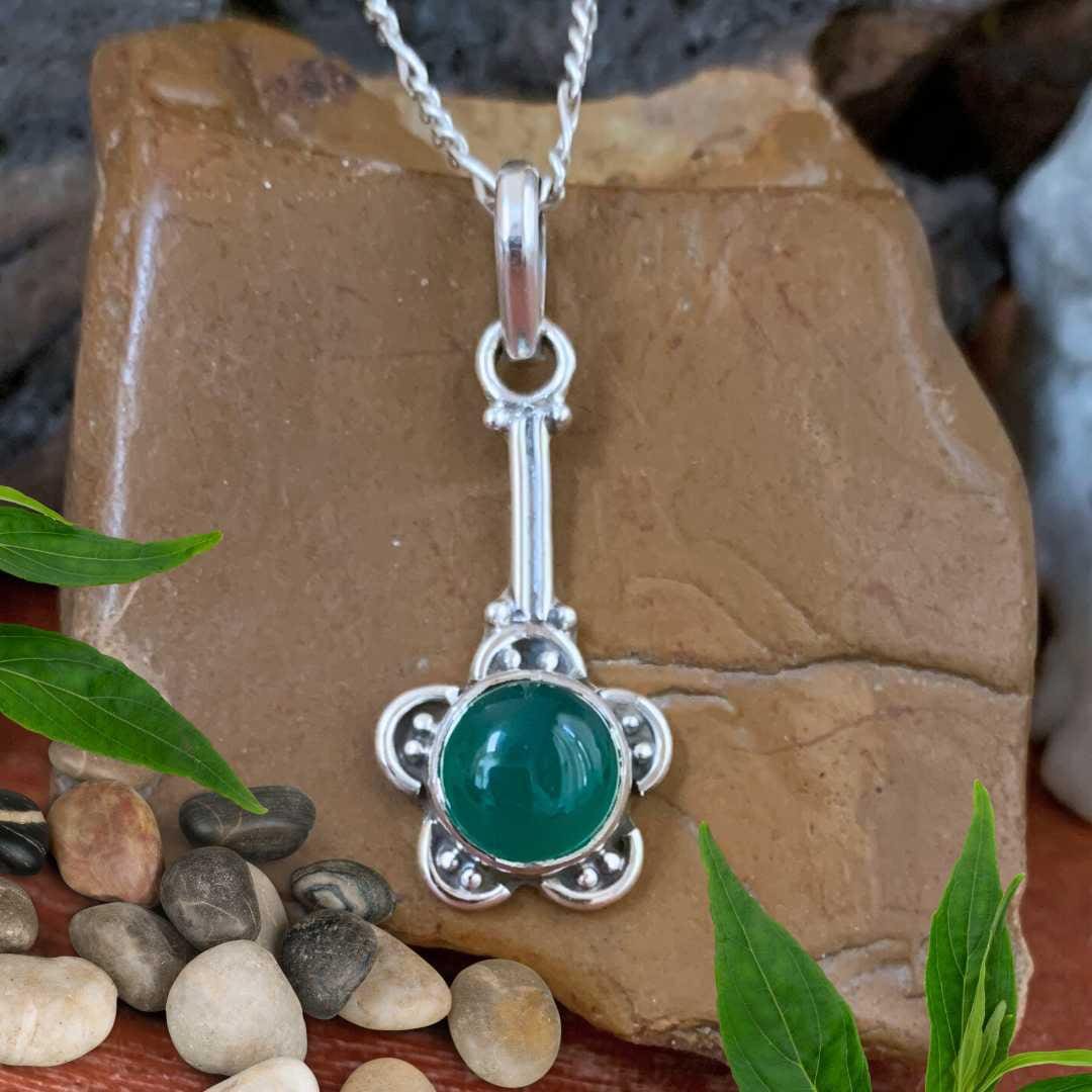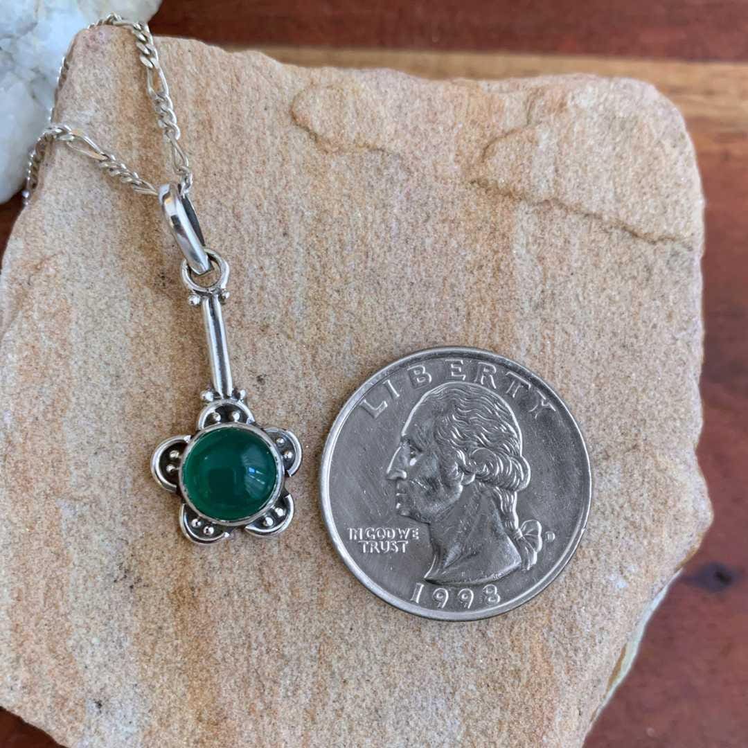 Bring natural charm to your collection with our Flower Green Onyx and Sterling Silver Pendant. A vibrant green onyx gemstone sits at the center of a delicate sterling silver floral design, combining classic beauty with subtle sophistication. Considered by some for promoting strength and balance, green onyx adds both meaning and style to this nature-inspired piece. Perfect for everyday wear or as a thoughtful gift, this pendant offers timeless charm for any jewelry lover.