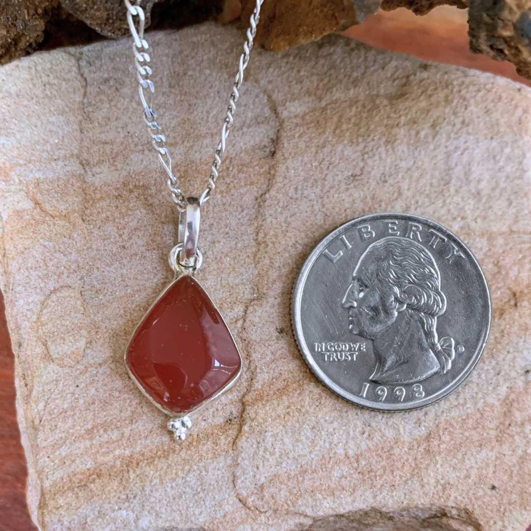 Enhance your jewelry collection with our Geometric Carnelian and Sterling Silver Pendant. It is a simple yet striking design that highlights the natural beauty of carnelian. The warm, vibrant orange gemstone is set in sleek sterling silver, accented by delicate silver beadwork at the base for a nice finishing touch. Considered by some as a stone of courage and creativity, carnelian adds both elegance and meaning to your pendant collection. Perfect for everyday wear or as a thoughtful gift, this pendant brings a modern geometric look with timeless appeal.