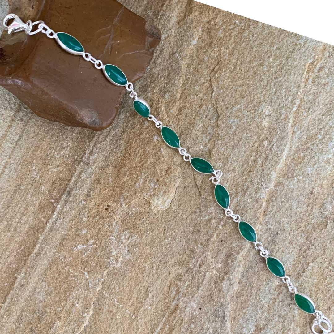 Our Green Onyx Marquise and Sterling Silver Bracelet features vibrant marquise-shaped green onyx gemstones set in polished sterling silver. Elegant and eye-catching, this bracelet adds a touch of rich color and timeless style to any jewelry collection.