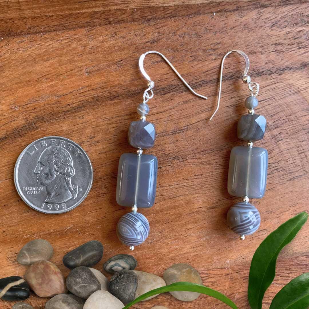 Our Grey and Botswana Dangle Beaded Earrings highlight the understated beauty of natural agate stones. A sleek rectangular grey agate bead takes center stage, anchored by a round Botswana banded agate bead and accented with a faceted cube-shaped Botswana agate topped with a petite round bead. Each stone is separated by delicate 2mm sterling silver beads and finished with a .925 sterling silver ear hook. Known for its soft greys and subtle banding, Botswana agate brings depth and quiet elegance to these versatile earrings—perfect for everyday wear or polished, layered looks.