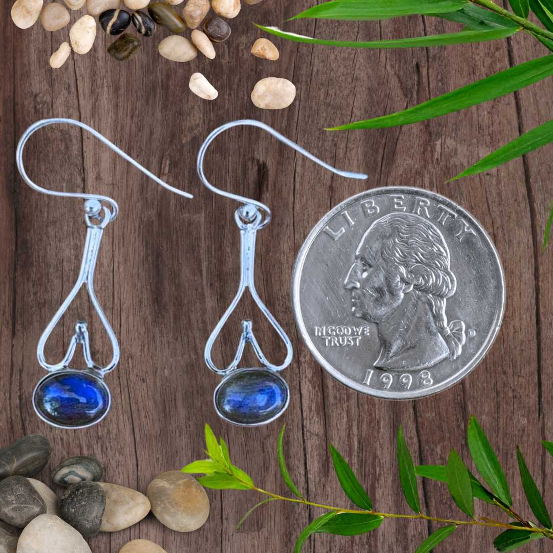 Our Labradorite and Sterling Silver Heart Earrings are a drop earring with a romantic flair. But they are so much more! This iridescent gemstone shows flashes of blue when the light dances upon it. The oval stone drops from sterling silver upside down hearts. A unique look for a stunning stone. The perfect Valentine’s Day jewelry!