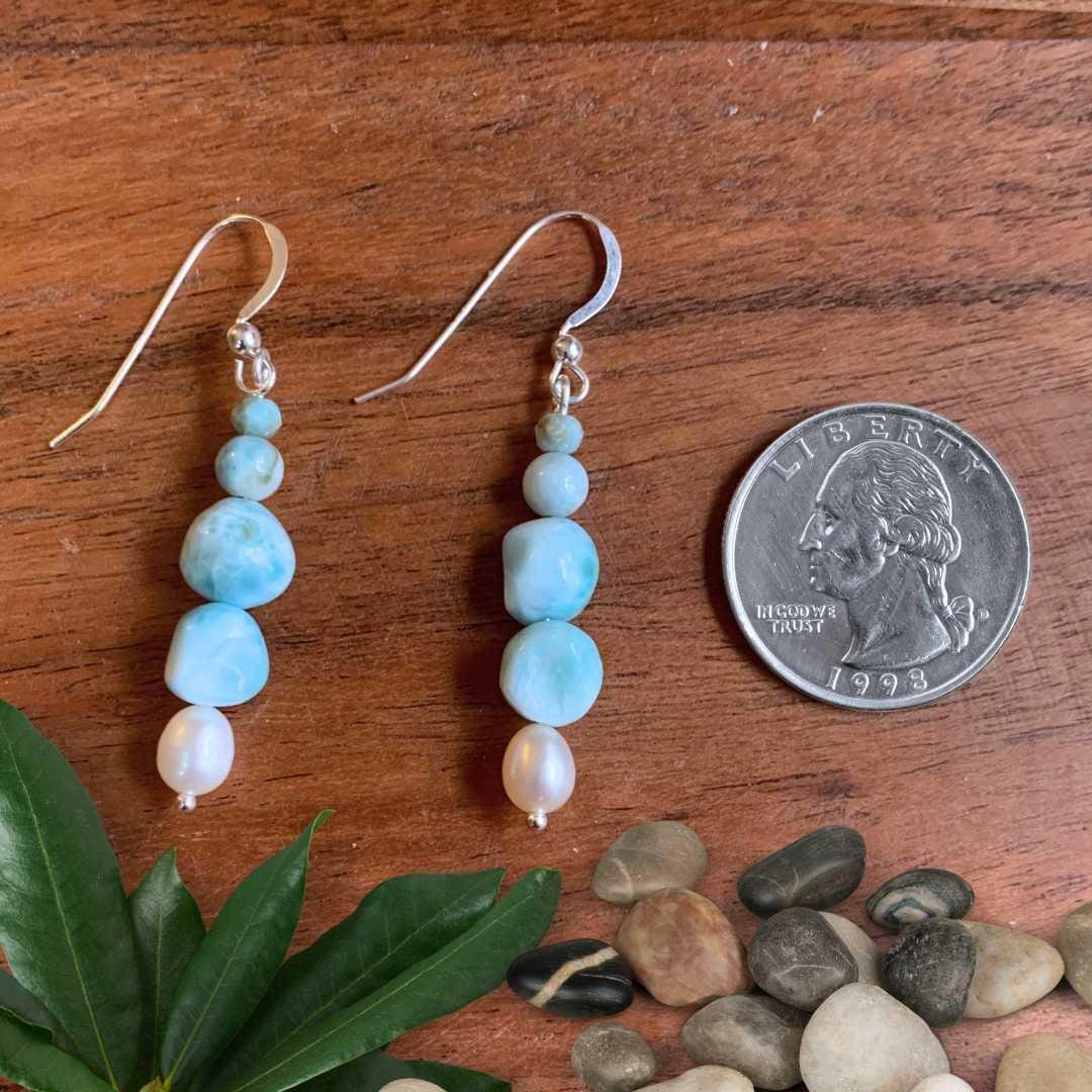 Our Larimar and Pearl Beaded Dangle Earrings pair the serene blue beauty of Larimar with the timeless elegance of freshwater pearls. Each earring features a luminous pearl at the base, topped with assorted shapes and sizes of genuine Larimar beads, creating natural texture and ocean-inspired charm. With a flattering medium dangle and sterling silver earring hooks, these handcrafted gemstone earrings are lightweight, graceful, and perfect for everyday wear or special occasions.