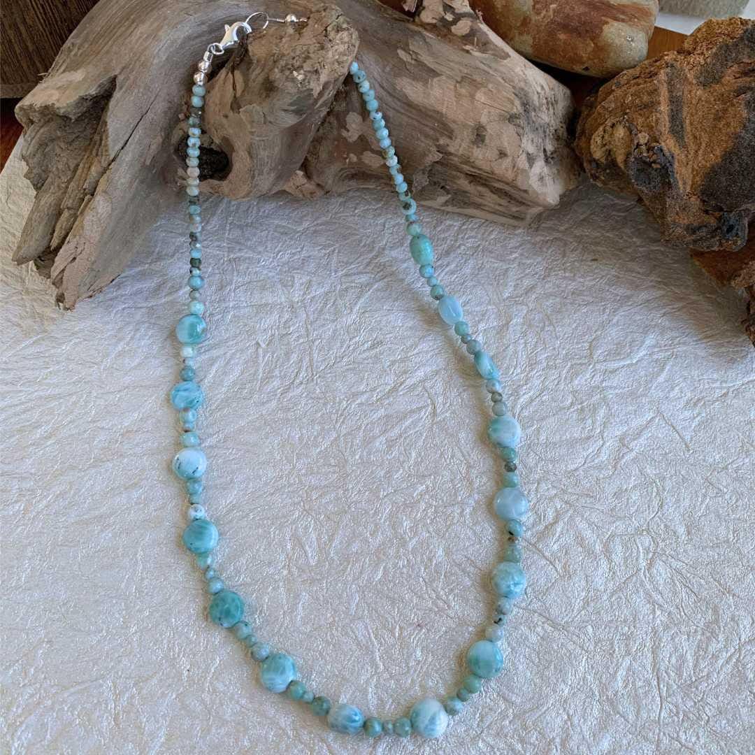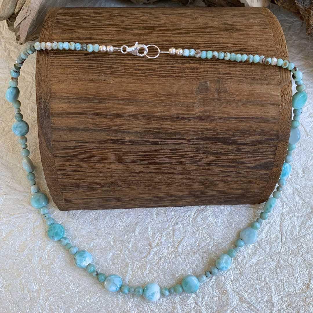 Larimar is prized for its calming color palette and organic patterns, making each stone truly one of a kind. This necklace is finished with sterling silver accent beads and a secure sterling silver lobster clasp. Measuring 20 inches in length, it is perfect worn on its own as a statement piece . You may also want to layer it with other favorites for a refined, coastal-inspired look.