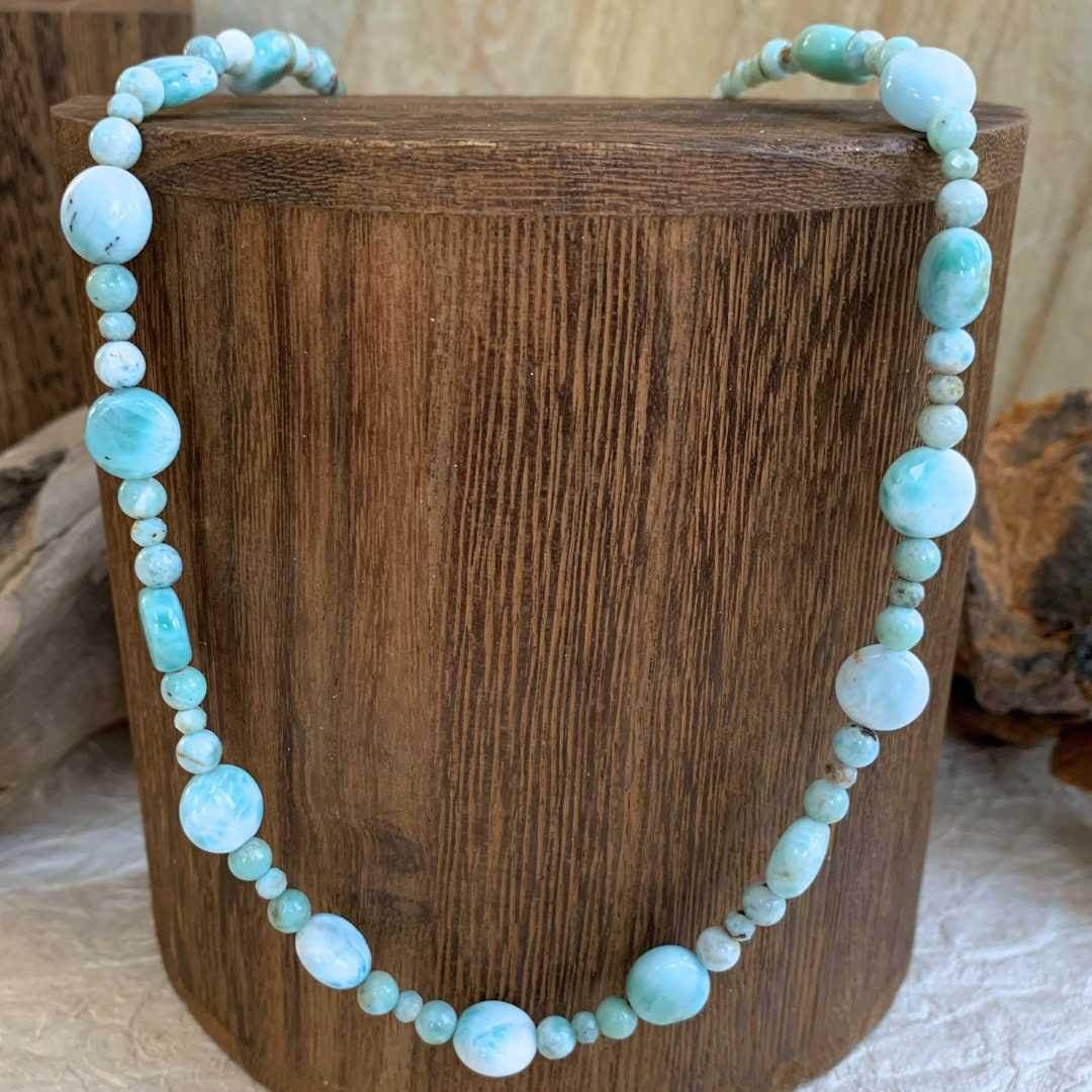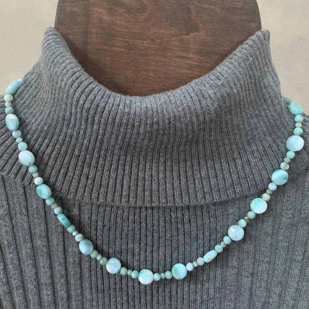 Experience the serene beauty of the Caribbean with our Larimar Coin Shaped Beads Necklace. This elegant necklace features 10 mm coin-shaped Larimar beads showcasing soft ocean blues and natural white marbling, paired with smooth round 5 mm beads and faceted 3 x 4 mm Larimar beads for added texture and sparkle. The mix of bead sizes and finishes creates a beautifully balanced design that drapes effortlessly along the neckline.