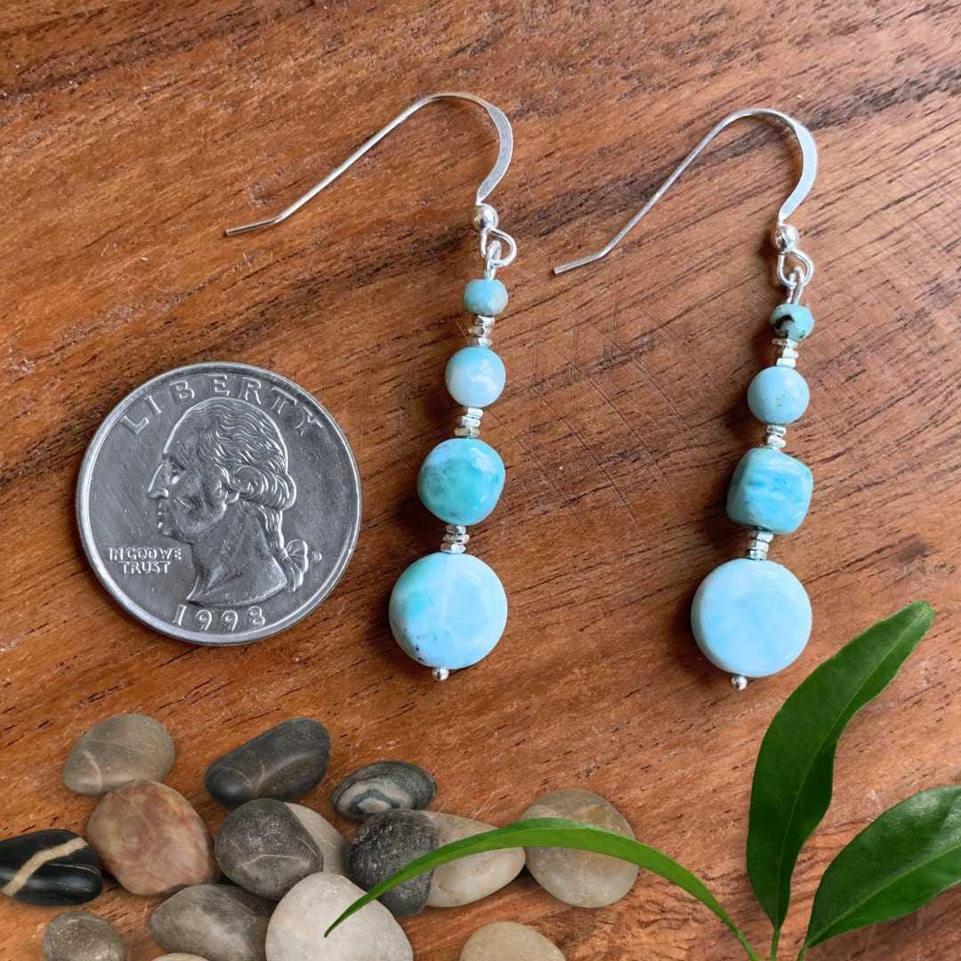 Our Larimar Mixed Dangle Beaded Earrings showcase the serene beauty of larimar with a harmonious mix of shapes and textures. Each earring features a round coin-shaped larimar bead paired with a natural nugget and smooth round bead. Each earring is topped with a delicate faceted accent. Tiny handmade silver spacer beads created by the Karen Hill Tribe of Thailand—crafted in a higher silver content of approximately 97–99%—add subtle shine and artisanal detail. The earrings also have a sterling silver ear hook. Known as the Stone of the Caribbean, larimar is prized for its soft ocean-blue hues that evoke calm seas and tropical skies, making these dangle earrings a refreshing and elegant statement.