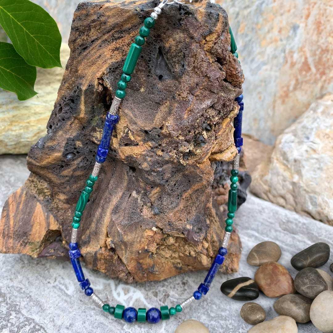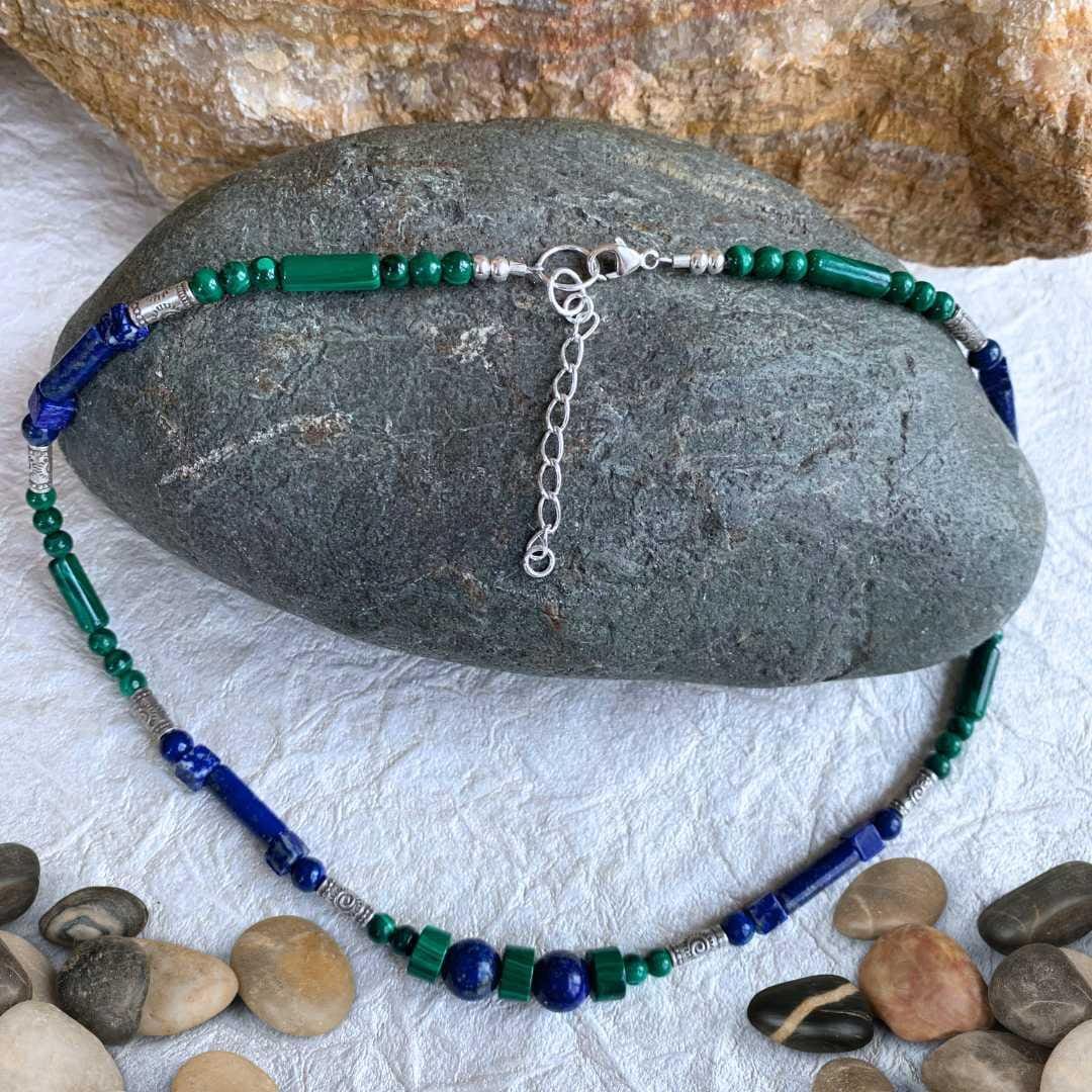 Our Malachite and Lapis with Artisan Beads Choker Necklace is a vibrant blend of rich color and handcrafted detail. Dainty malachite and lapis lazuli beads in alternating shapes create beautiful contrast, pairing malachite’s swirling green patterns with the deep royal blue of lapis. The true charm of this choker lies in the small tube beads handcrafted by the Karen Hill Tribe of Thailand, each stamped with a delicate spiral design and crafted in high-silver content metal (97–99% pure silver), exceeding traditional .925 sterling silver. Finished with sterling silver accent beads, a secure lobster clasp, and a 1.5-inch sterling silver extension chain, this 15.75-inch gemstone choker is perfect for layering or wearing as a bold standalone statement piece.