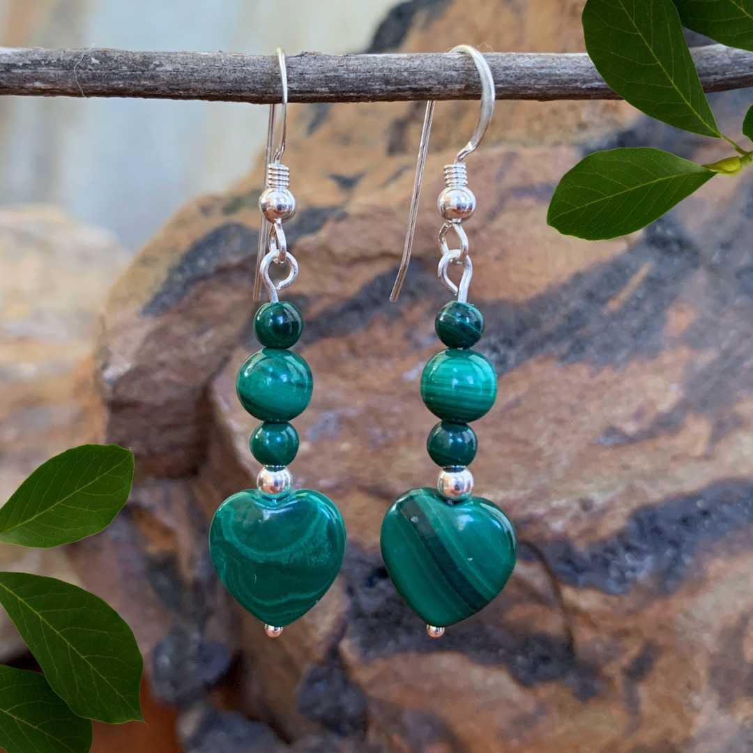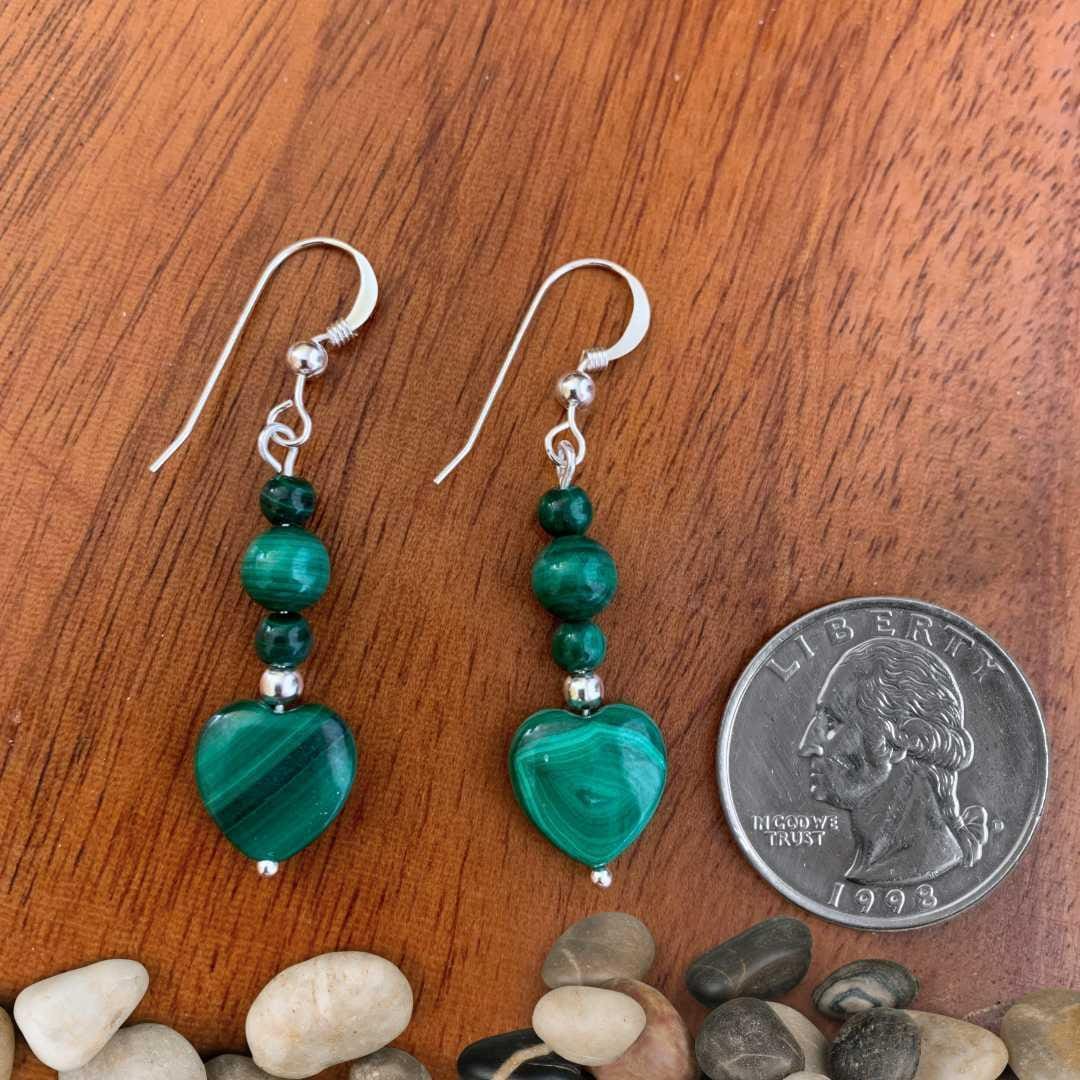 Malachite Heart and Sterling Silver Beaded Earrings