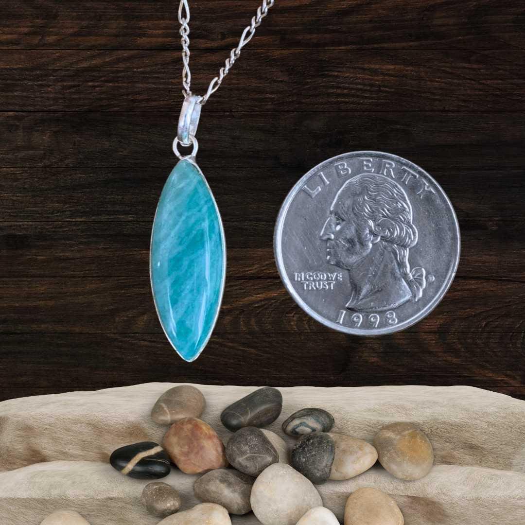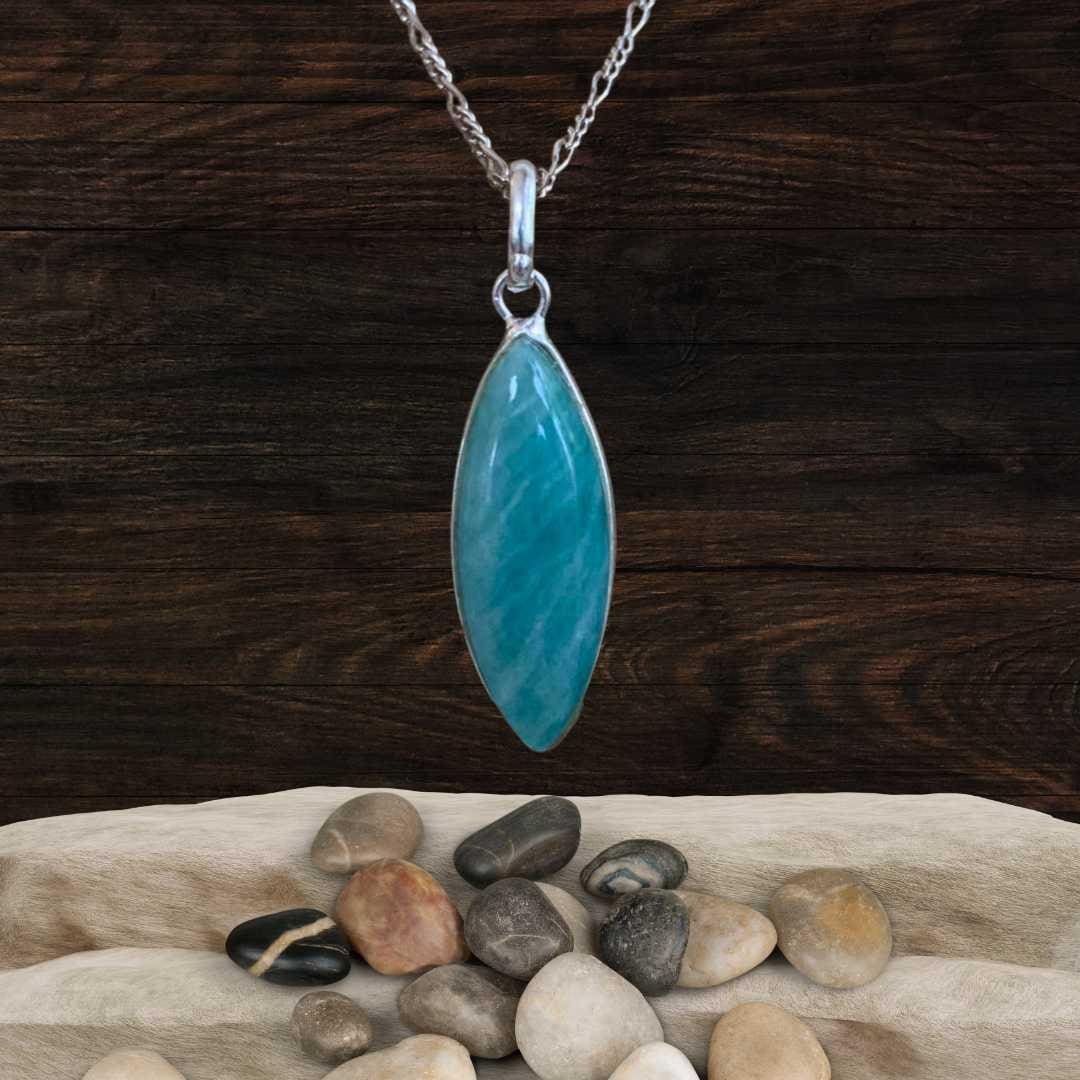 Elegant and soothing, our Marquise Amazonite and Sterling Silver Pendant features a marquise-cut amazonite gemstone set in polished sterling silver. The soft aqua-green tones of amazonite, often called the “stone of harmony,” are known for promoting balance, calm, and positive energy. Its sleek marquise shape adds a modern yet timeless appeal, making this pendant perfect for both everyday wear and special occasions. A meaningful piece that combines natural beauty with sterling silver craftsmanship, it’s also a thoughtful gift for anyone drawn to gemstone jewelry with symbolic depth.