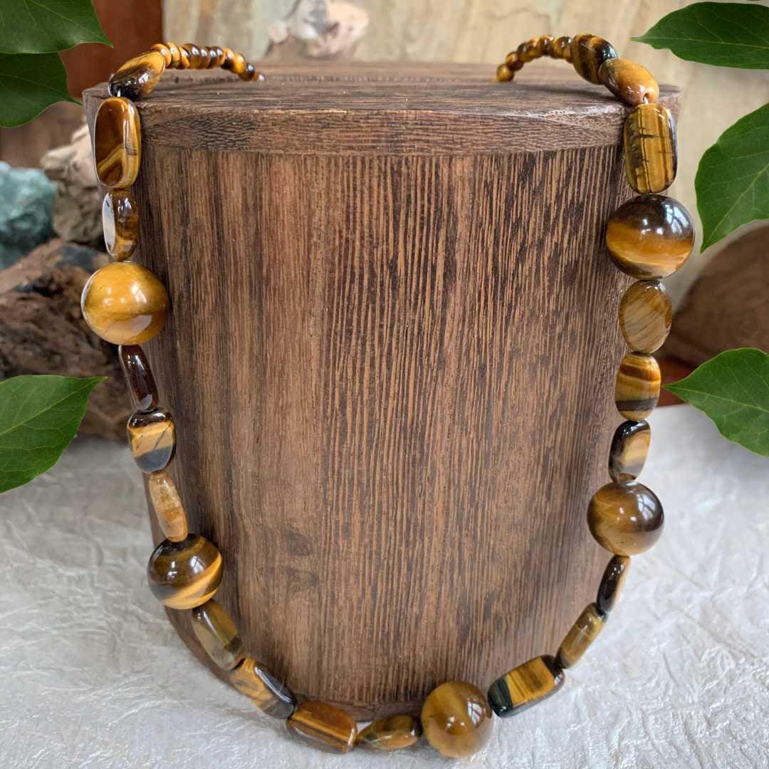 Discover our Mixed Tiger’s Eye Beaded Necklace. It is a beautifully handcrafted piece featuring three bead sizes that add visual interest, depth, and texture. This striking necklace showcases the natural beauty of Tiger’s Eye. This gemstone is known for its warm golden-brown tones and captivating chatoyancy that shifts in the light. Each bead reflects the stone’s signature shimmer, giving the necklace a timeless, earthy elegance.