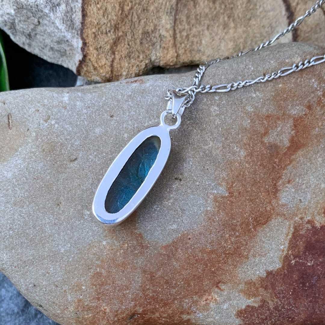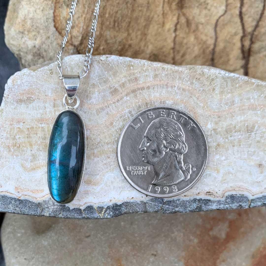 Elevate your style with our Oblong Labradorite and Sterling Silver Pendant, a simple yet striking design crafted with a substantial amount of sterling silver in the setting—clearly visible in the gallery images of the side and back. The centerpiece is a smooth oblong labradorite gemstone, celebrated for its enchanting play of color. When the light strikes at just the right angle, flashes of brilliant blue shimmer across the stone, creating a captivating iridescent effect known as labradorescence. Timeless and versatile, this pendant blends modern simplicity with the natural magic of labradorite, making it a meaningful addition to any jewelry collection.