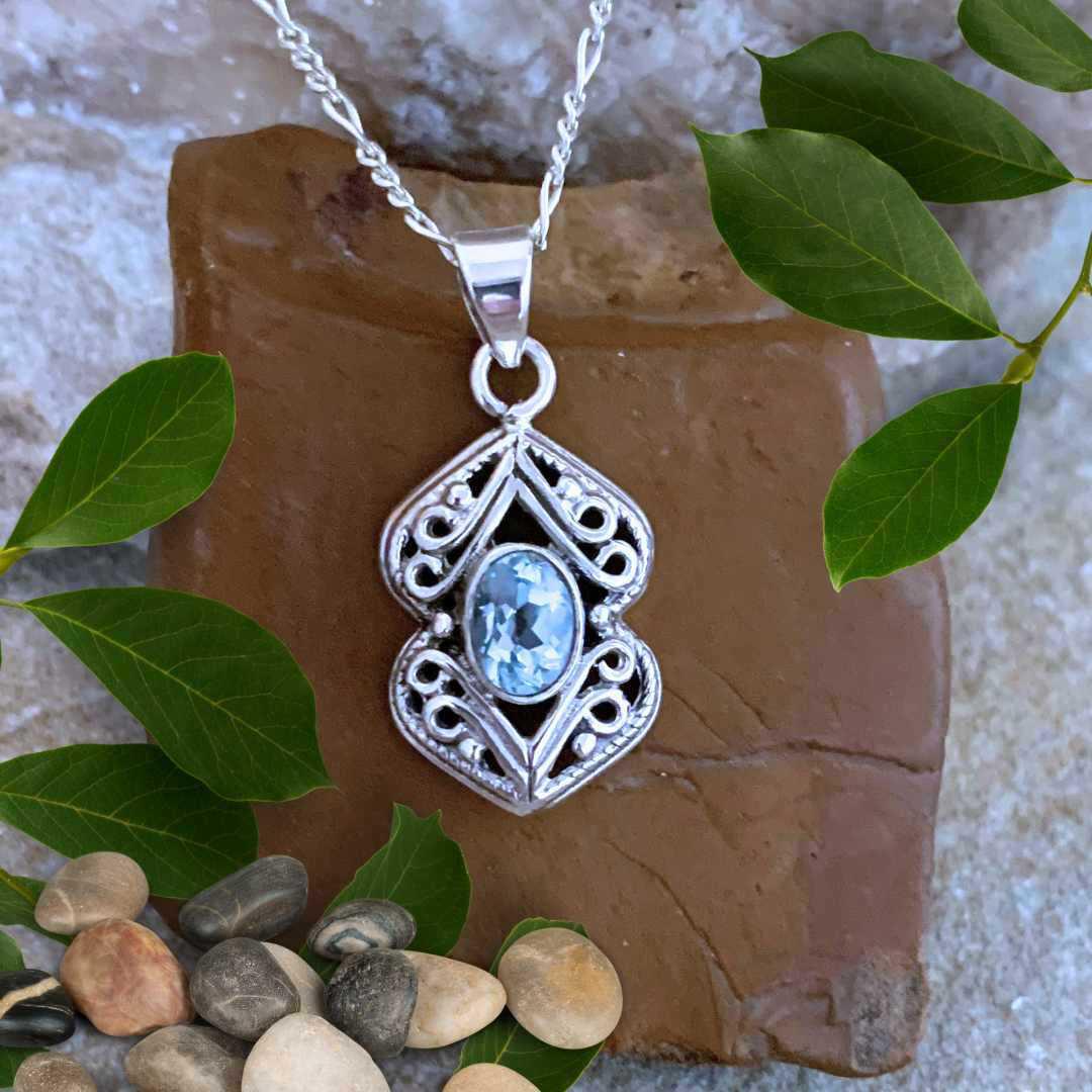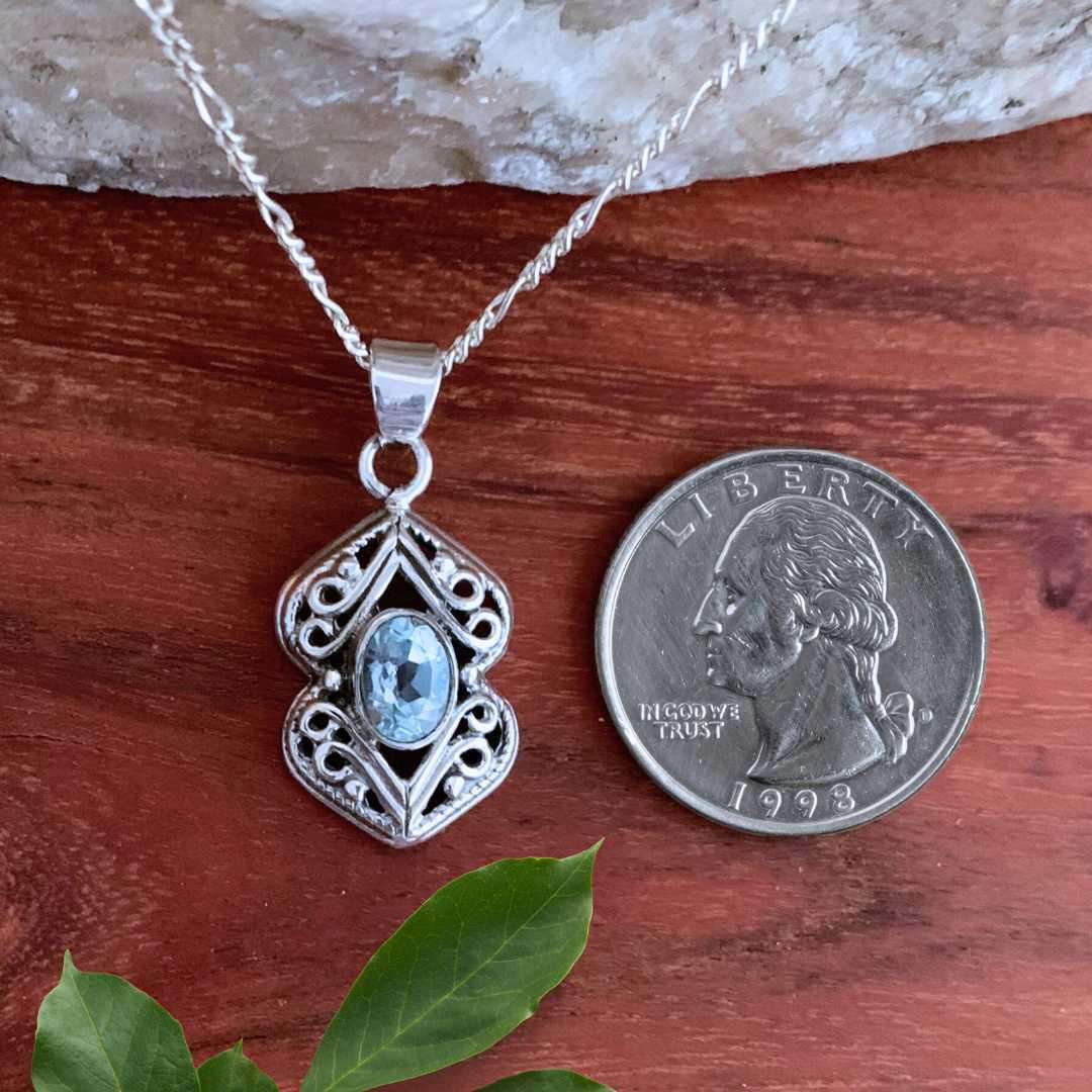 Add a touch of timeless elegance with our Oval Blue Topaz and Filigree Sterling Silver Pendant. Featuring a shimmering faceted blue topaz framed in delicate sterling silver filigree, this pendant blends classic beauty with intricate craftsmanship. A perfect gift for December birthdays or anyone who loves graceful gemstone jewelry.