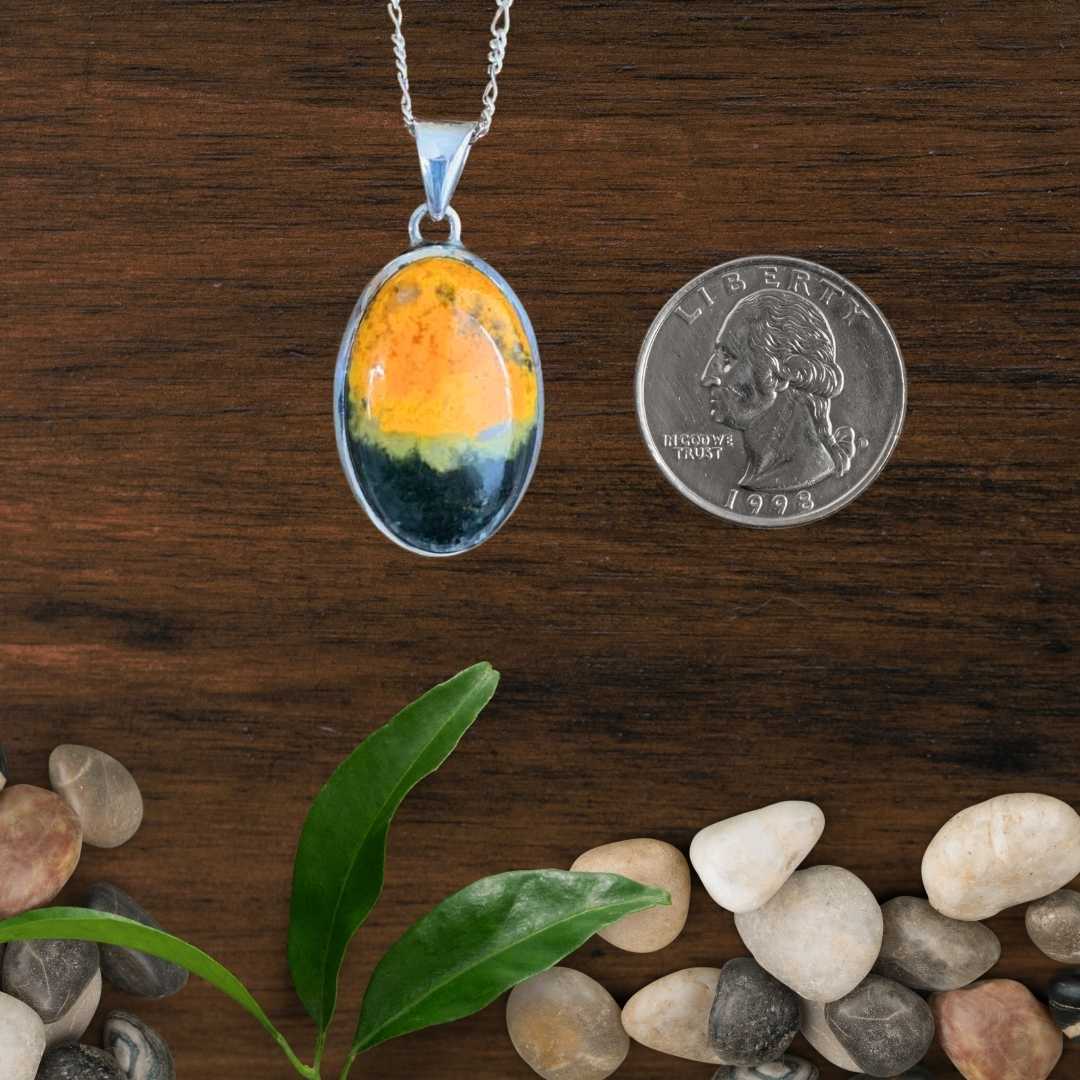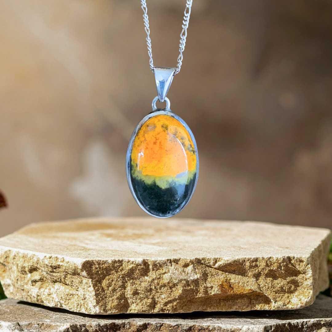 Elevate your jewelry collection with our striking Oval Bumblebee Jasper and Sterling Silver Pendant, a one-of-a-kind statement piece showcasing the natural beauty of this rare and vibrant gemstone. The polished oval cabochon features Bumblebee Jasper’s signature bands of golden yellow, charcoal gray, and warm orange — dramatic patterns formed by volcanic activity and mineral-rich deposits, making every pendant completely unique.