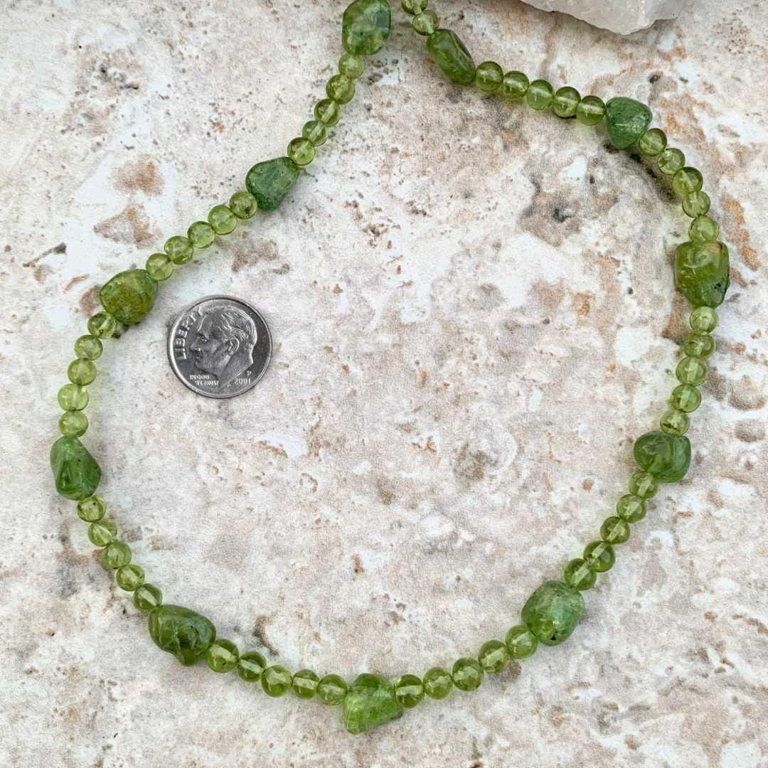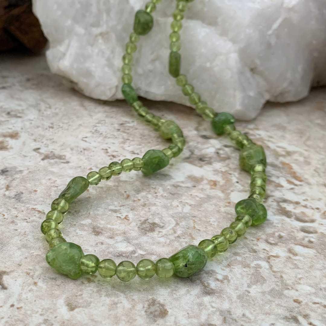 Our Peridot Nuggets and Beads Necklace highlights the fresh, vibrant green of August’s birthstone with a beautiful mix of smooth freeform peridot nuggets and round peridot beads. Each natural nugget adds unique character and texture, while the round beads create a harmonious, polished look. Finished with sterling silver beads and a secure sterling silver lobster clasp, this handcrafted necklace measures 20.25 inches and includes a 1.5-inch extension chain for adjustable comfort.