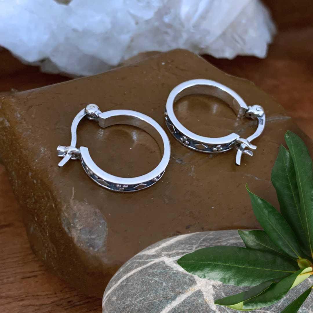 Sleek and stylish, our Petite Diamonds and Dots Sterling Silver Click Hoop Earrings feature a contemporary design with a pattern of diamond shapes and dots that wrap around the outer edges. The hoops have a nice thickness for such a petite earring, offering a bold look that complements any outfit. Designed with a secure click hoop closure, these earrings are easy to wear while staying safely in place. Perfect for everyday wear or special occasions, these sterling silver hoops bring a modern edge to a timeless classic.