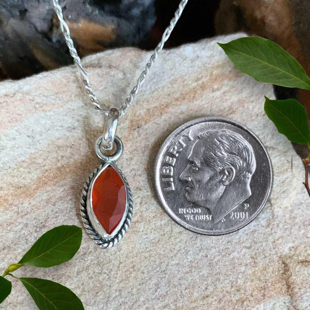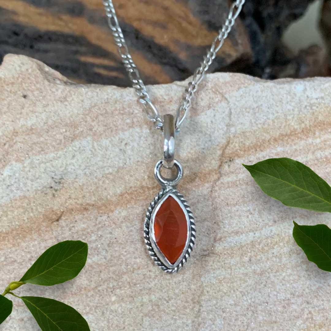Our Petite Marquise Carnelian Sterling Silver Pendant brings a subtle pop of color and elegance to any look. This delicate pendant features a faceted marquise-shaped carnelian gemstone set in genuine sterling silver. iT gives it a refined sparkle that catches the light beautifully. Small and versatile, it’s perfect for wearing alone or layering with other pendants for a personalized, stylish look.