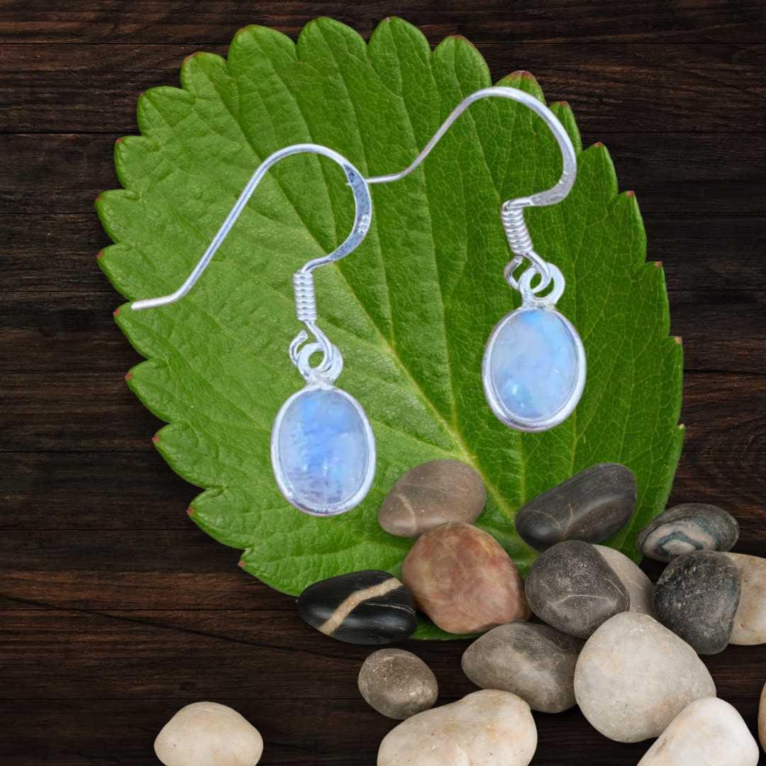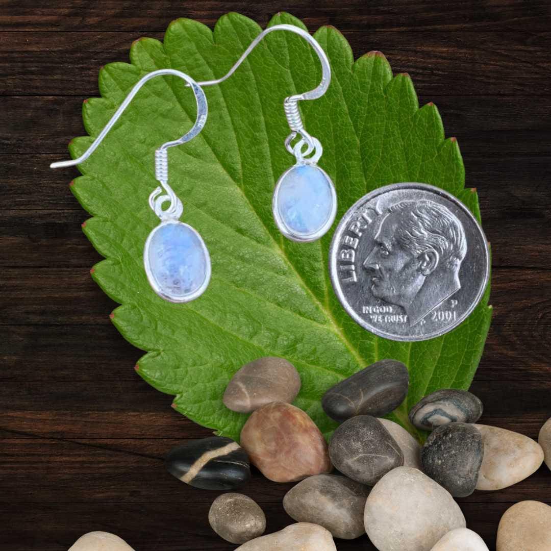 Delicate and enchanting, our Petite Oval Rainbow Moonstone and Sterling Silver Earrings feature horizontally set oval rainbow moonstones with a subtle dangle for gentle movement. The gemstones display a captivating iridescent shimmer, revealing flashes of blue, gold, and rainbow tones when the light hits at just the right angle. Set in sterling silver, these earrings combine understated elegance with mystical beauty, making them perfect for everyday wear or as a thoughtful gift for someone special.