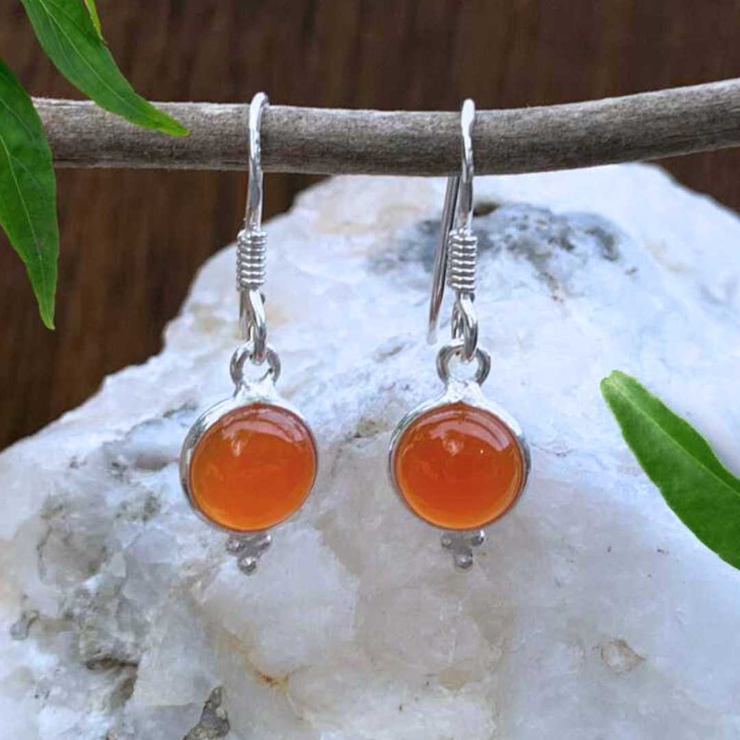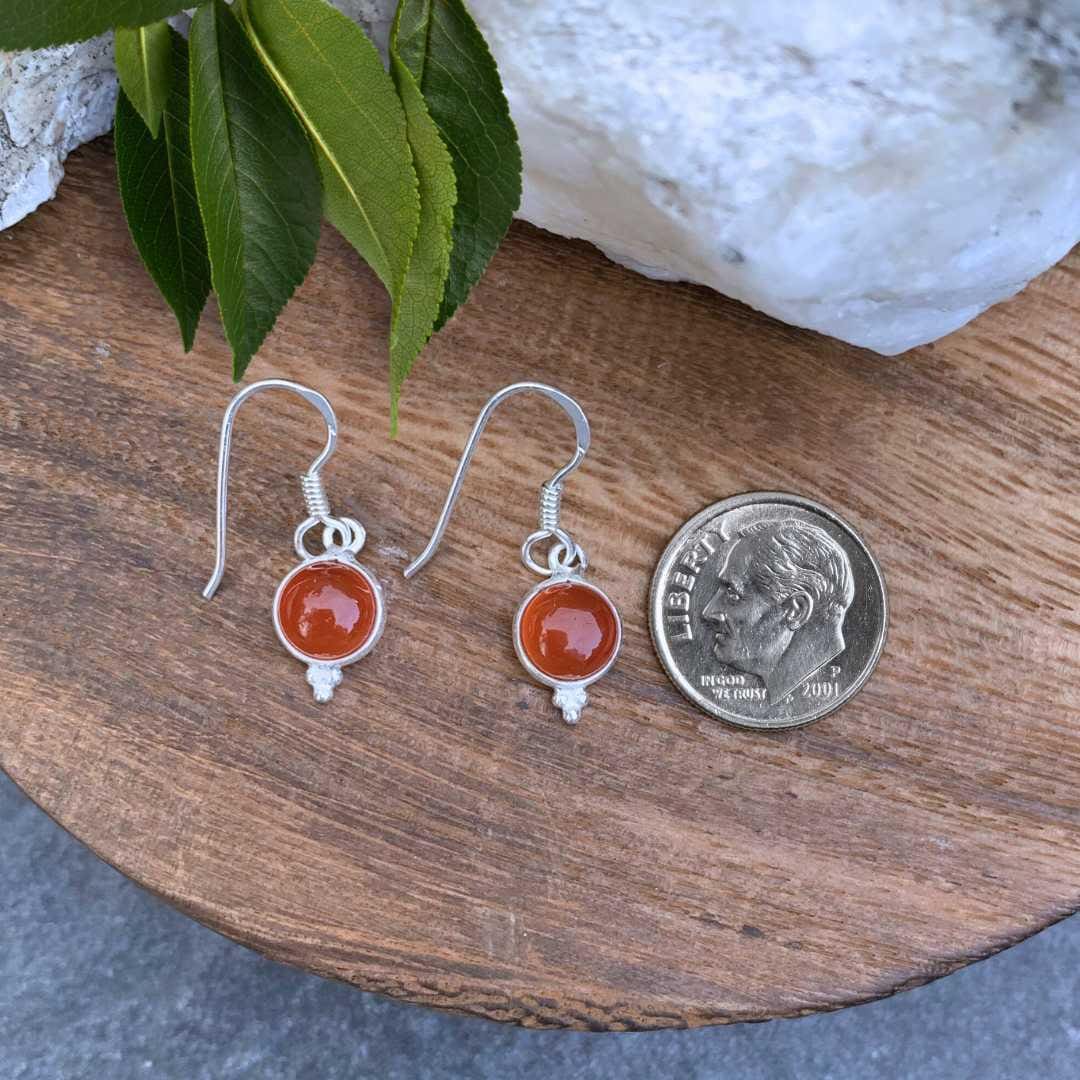 Our Petite Round Carnelian and Sterling Silver Earrings offer that little splash of color and subtle dangle you will love each time you wear them. Carnelian is a vibrant translucent orange-reddish gemstone variety of chalcedony.  It has been valued since ancient times for its color and symbol of courage, vitality and confidence.