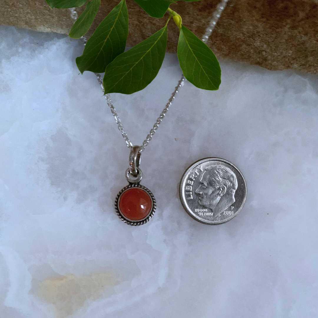 Add a bold pop of color with our Petite Round Carnelian and Sterling Silver Pendant. This vibrant orange-red carnelian stone is set in oxidized sterling silver. It creates a warm and energizing accent perfect for everyday wear or thoughtful gifting.