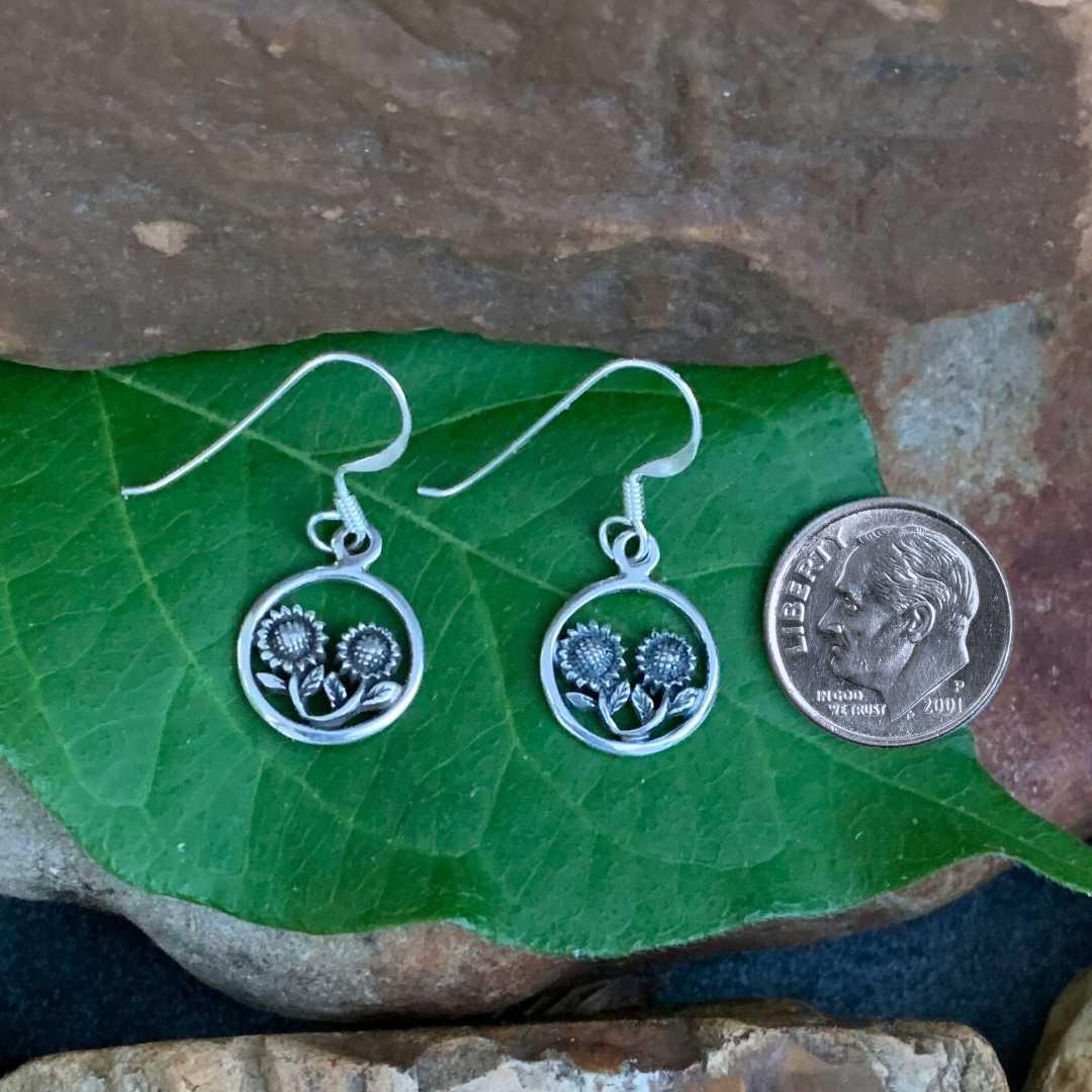 Add a touch of sunshine to your style with our Petite Sterling Silver Sunflower Duo Earrings. Each earring features two delicate sunflowers gracefully framed within a polished sterling silver circle, creating a charming and timeless design. Perfectly petite with a bit of dangle, they’re ideal for everyday wear or as a sweet gift for nature lovers.