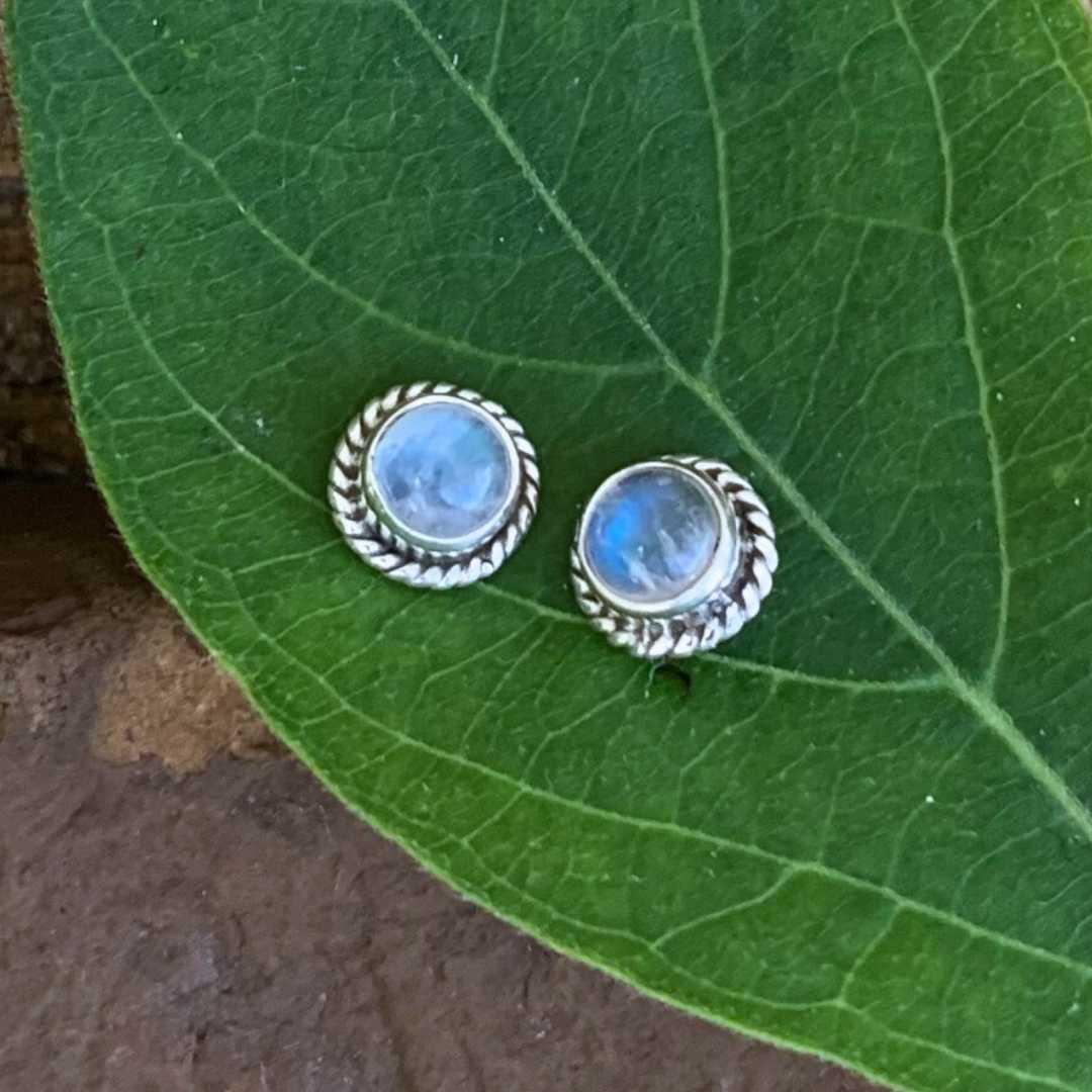 • Rainbow Moonstone and Sterling Silver Round Stud Earrings