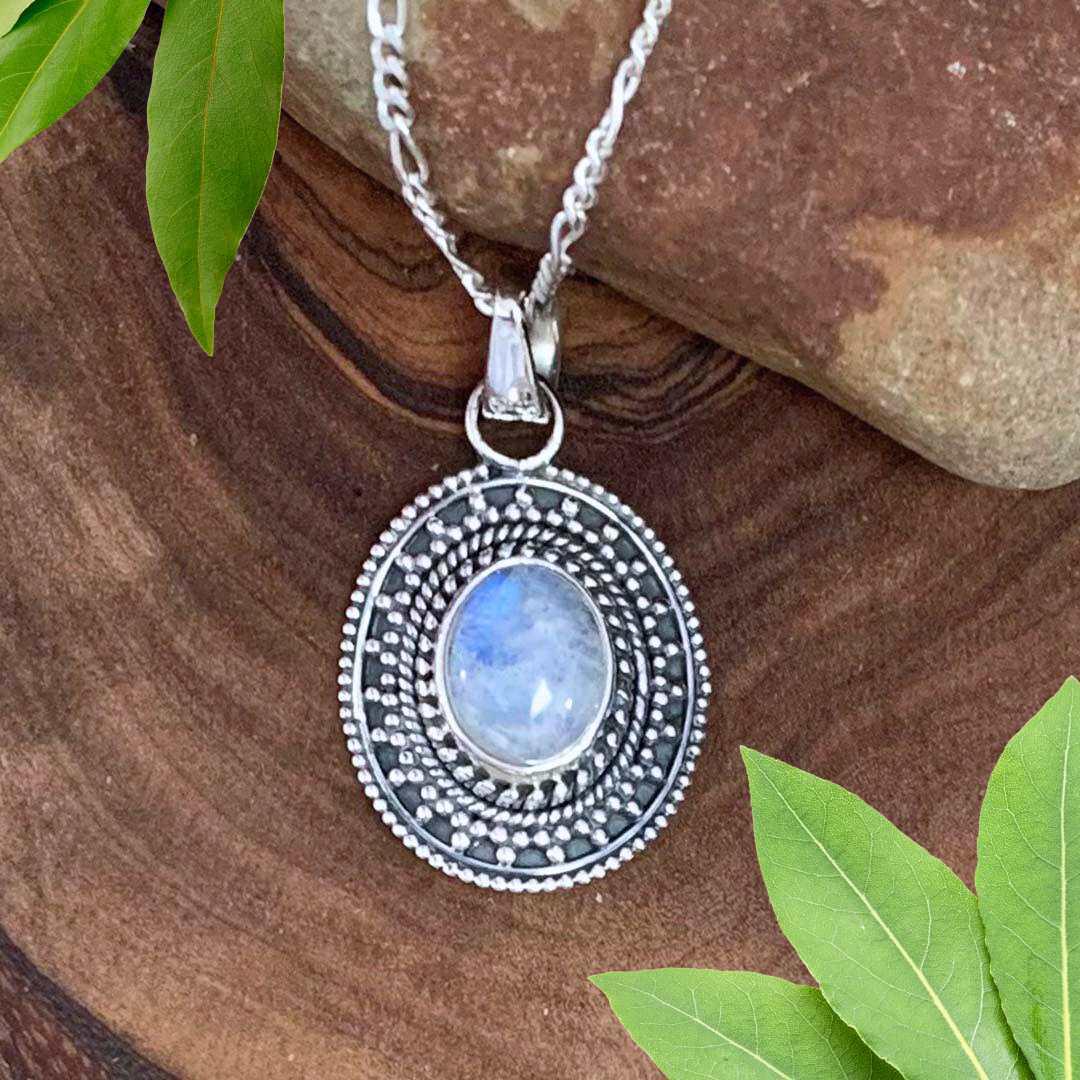 This Rainbow Moonstone and Sterling Silver Ornate Pendant is an oval piece of beautiful detail. With oxidation giving it a vintage and boho look, this piece will look good with every outfit in your wardrobe!