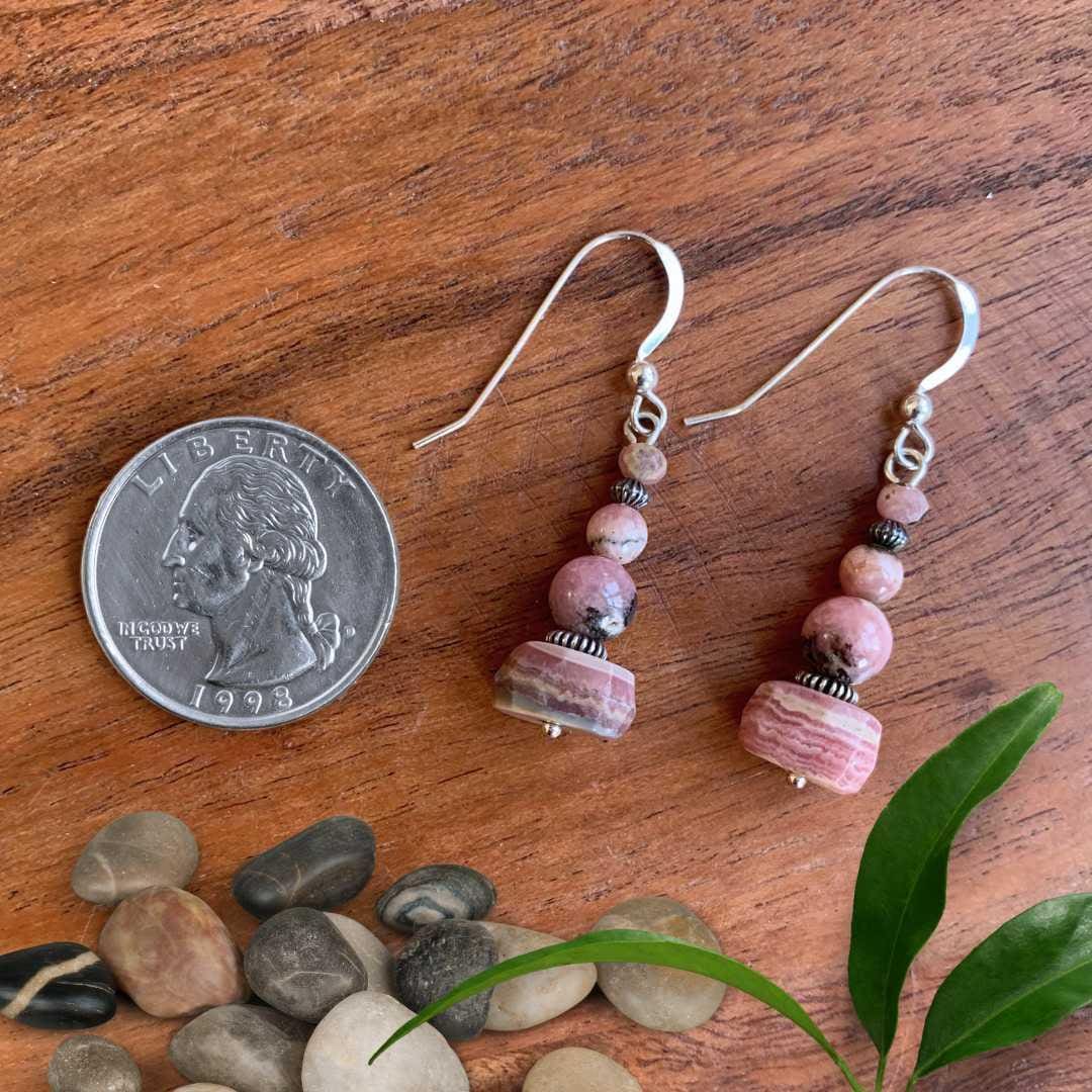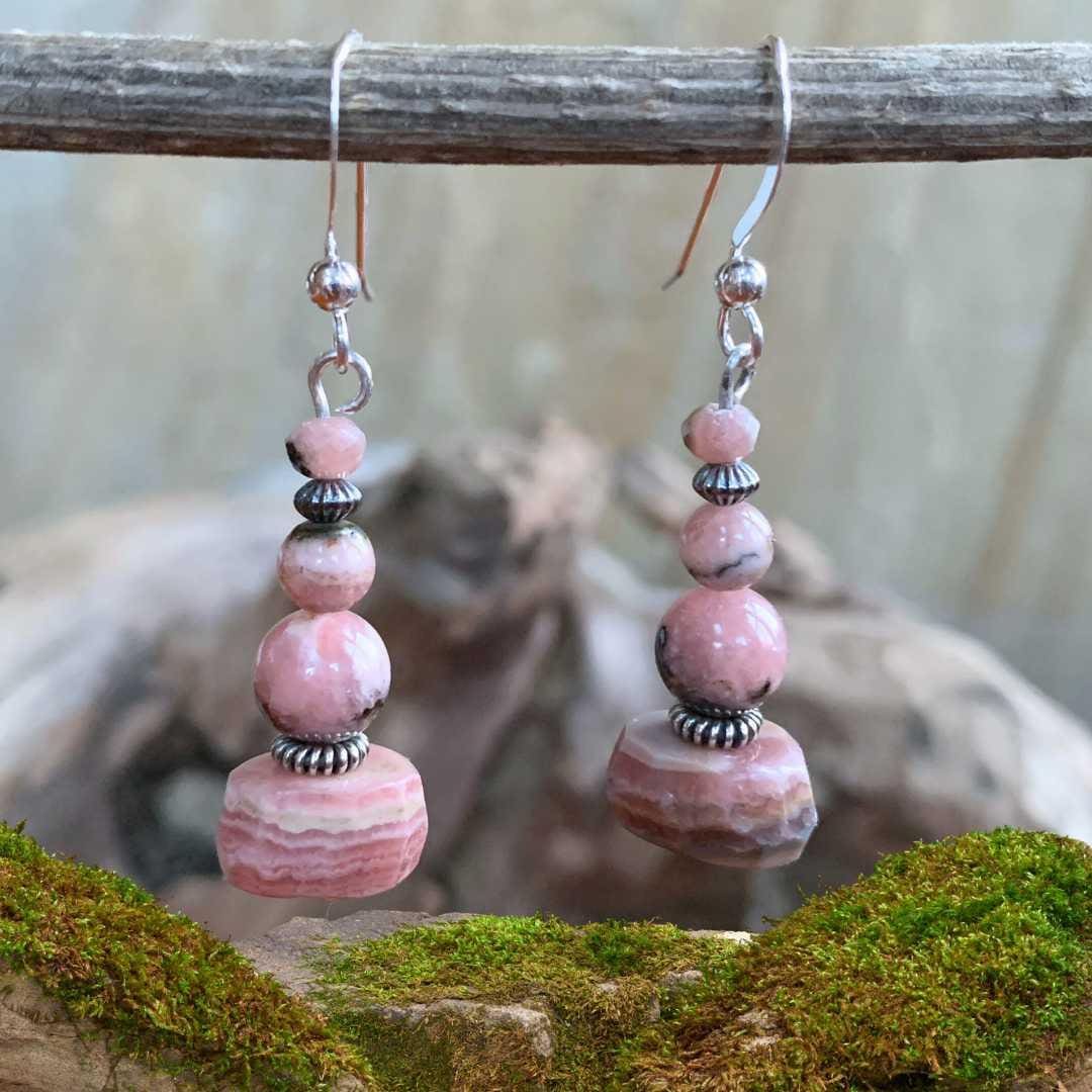 Our Rhodochrosite and Sterling Silver Beaded Earrings feature a beautiful mix of rhodochrosite beads in varying shapes and sizes, highlighting the stone’s soft pink tones and natural banding. Oxidized sterling silver spacer beads add depth and contrast, enhancing the organic, handcrafted look. Finished with sterling silver ear hooks, these earrings offer gentle movement and romantic color. Rhodochrosite is often associated with love and compassion, making these earrings a meaningful and elegant addition to any jewelry collection.