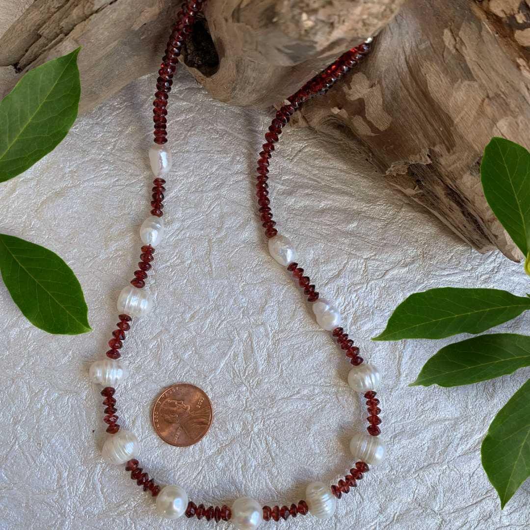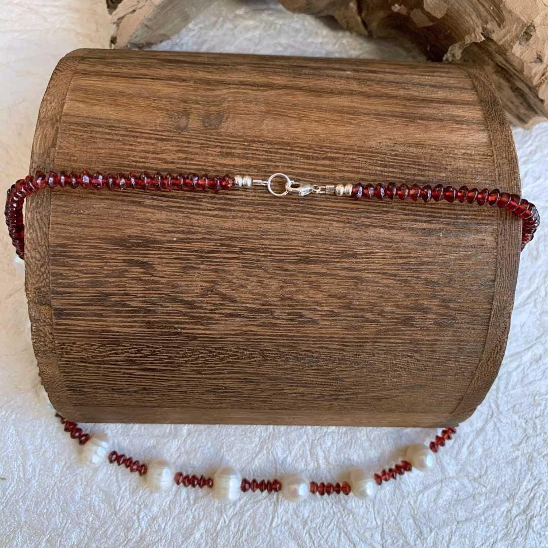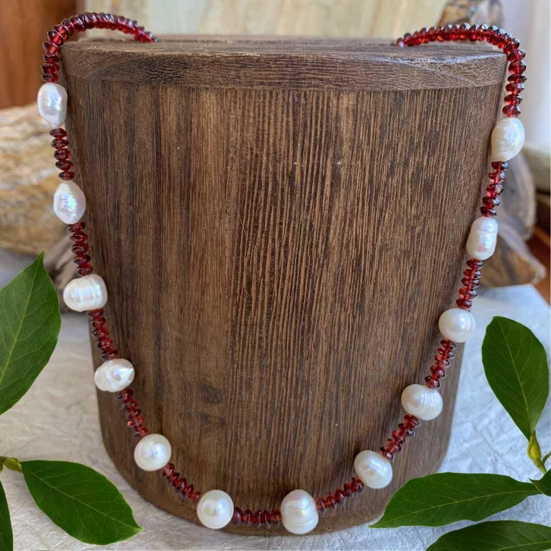 Our Rondelle Garnets and Freshwater Pearls Necklace blends rich color with timeless elegance. Smooth garnet rondelle beads are beautifully spaced between two sizes of luminous freshwater pearls, creating a balanced and eye-catching pattern. Garnet, the birthstone for January, adds deep warmth, while pearls, June’s birthstone, bring a classic softness to the design.