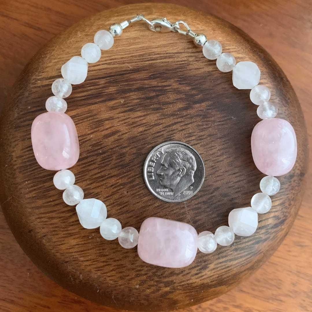 Add a soft, feminine touch to your style with our Rose Quartz and Sterling Silver Beaded Bracelet. Featuring three large barrel-shaped rose quartz beads accented by faceted twisted beads and smooth round stones, this bracelet offers beautiful texture and gentle sparkle. Finished with sterling silver beads and a secure lobster clasp, it’s perfect for everyday elegance. Known as the stone of love, rose quartz is cherished for its soothing energy and delicate blush pink hue.