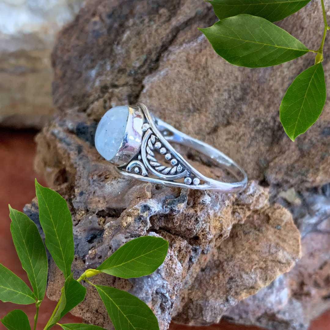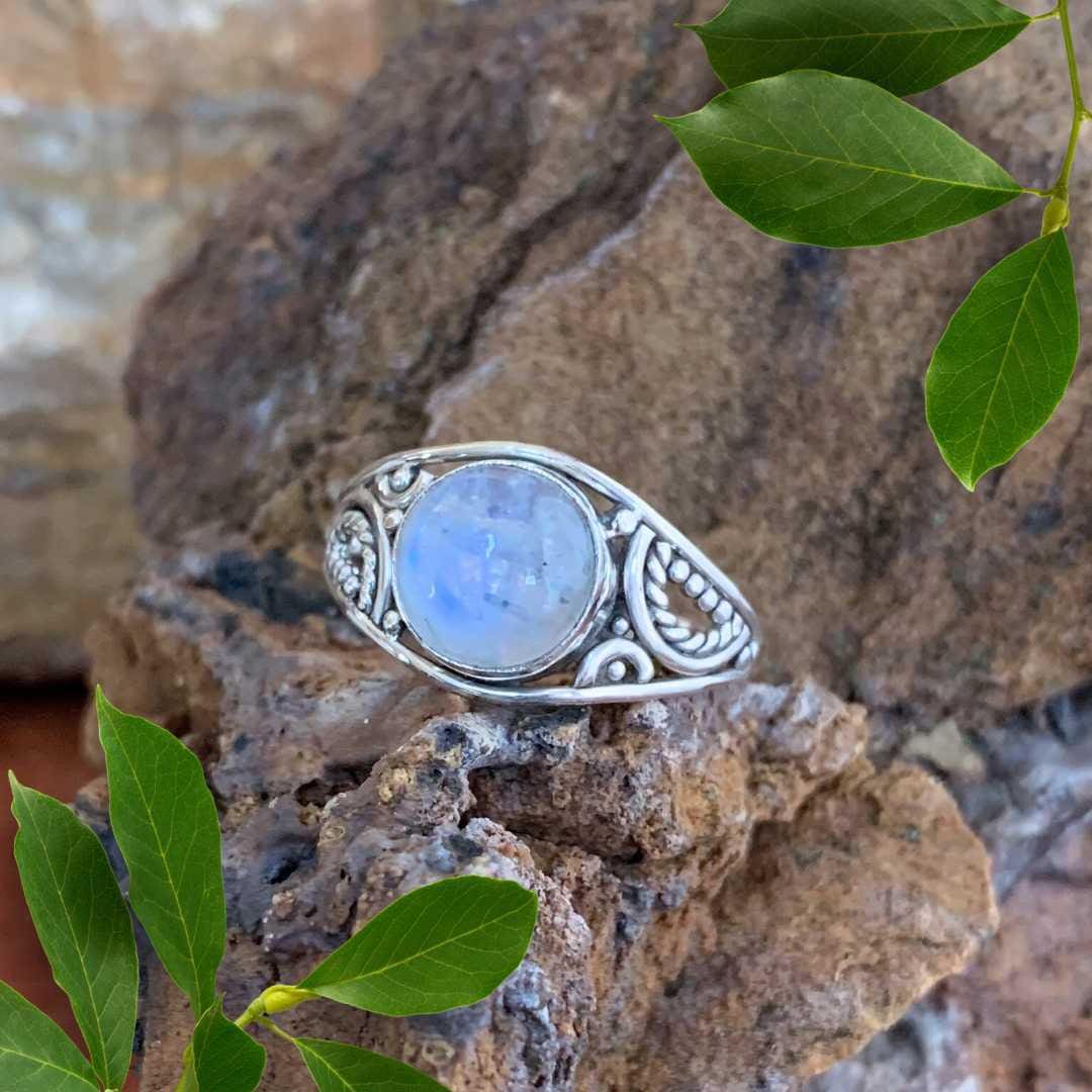 Embrace timeless elegance with our Round Rainbow Moonstone Filigree Sterling Silver Ring. A luminous round rainbow moonstone shimmers at the center, reflecting flashes of blue and iridescent hues with every movement. The stone is beautifully framed in sterling silver filigree work. Moonstone is often called the “stone of new beginnings,” symbolizing intuition, balance, and feminine energy. Perfect as a statement ring or everyday favorite, this piece is a thoughtful gift for anyone who loves gemstone jewelry with meaning and artistry.