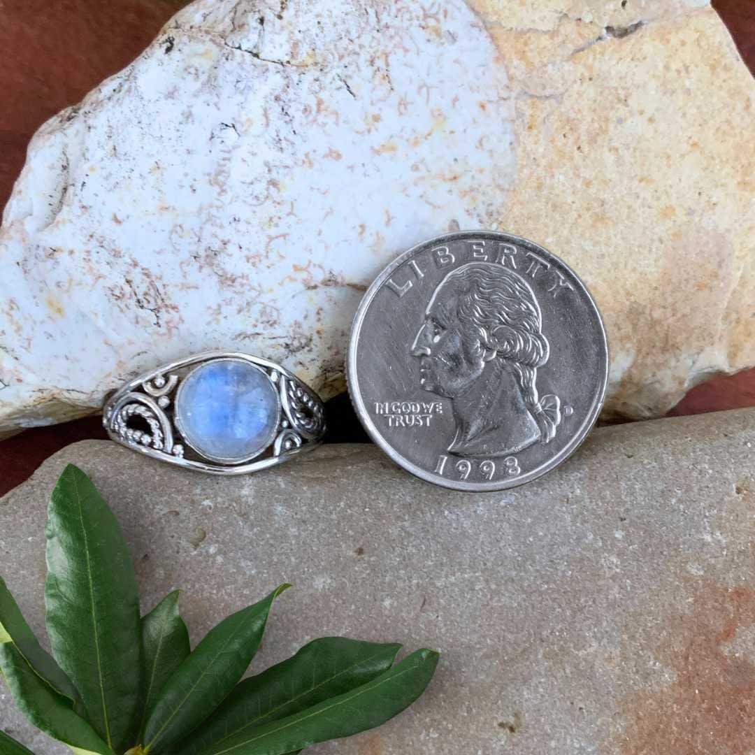 Round Rainbow Moonstone Filigree Sterling Silver Ring