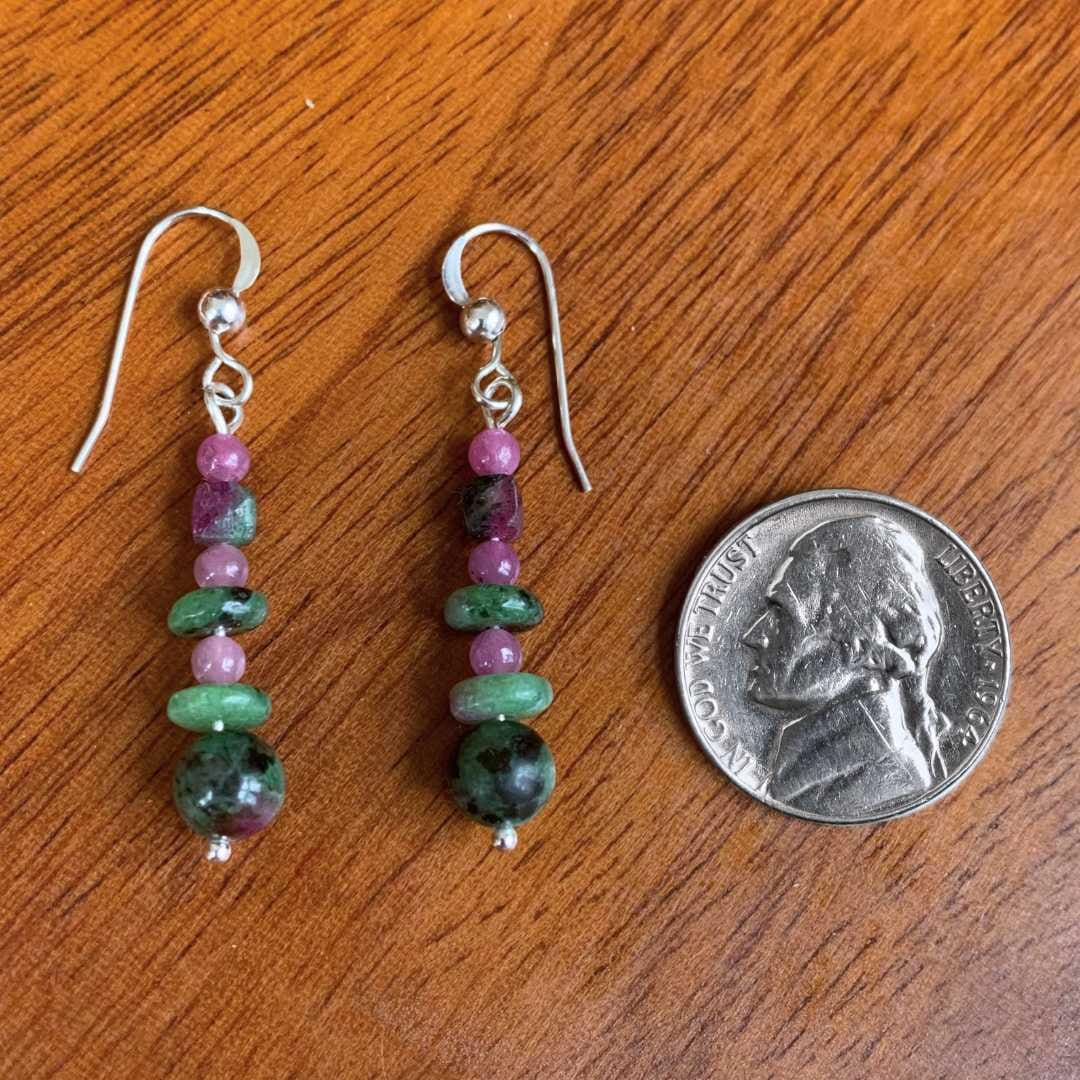 Our Ruby Zoisite and Ruby Beaded Earrings offer a bold blend of vibrant color and natural elegance. These dangling earrings feature a mix of richly patterned ruby zoisite beads accented with petite smooth round ruby beads, creating a striking contrast between deep green, black, and raspberry-red tones. The graceful dangle design adds soft movement, while sterling silver earring hooks provide a polished, comfortable finish.