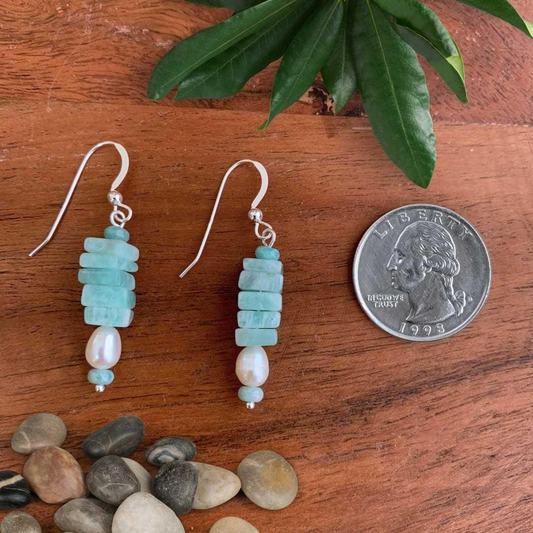 Our Square Stacked Amazonite with Pearl Earrings capture the calming beauty of the sea in a stylish, handcrafted design. Five non-uniform square amazonite beads are stacked for natural texture and interest, framed by smooth amazonite rondelle beads and anchored with a luminous freshwater pearl. The soft aqua tones paired with the creamy pearl evoke ocean waves and sandy shores, making these medium dangle earrings perfect for a beach getaway or your next cruise. Finished with sterling silver earring hooks, these gemstone earrings offer effortless coastal elegance for any outfit.