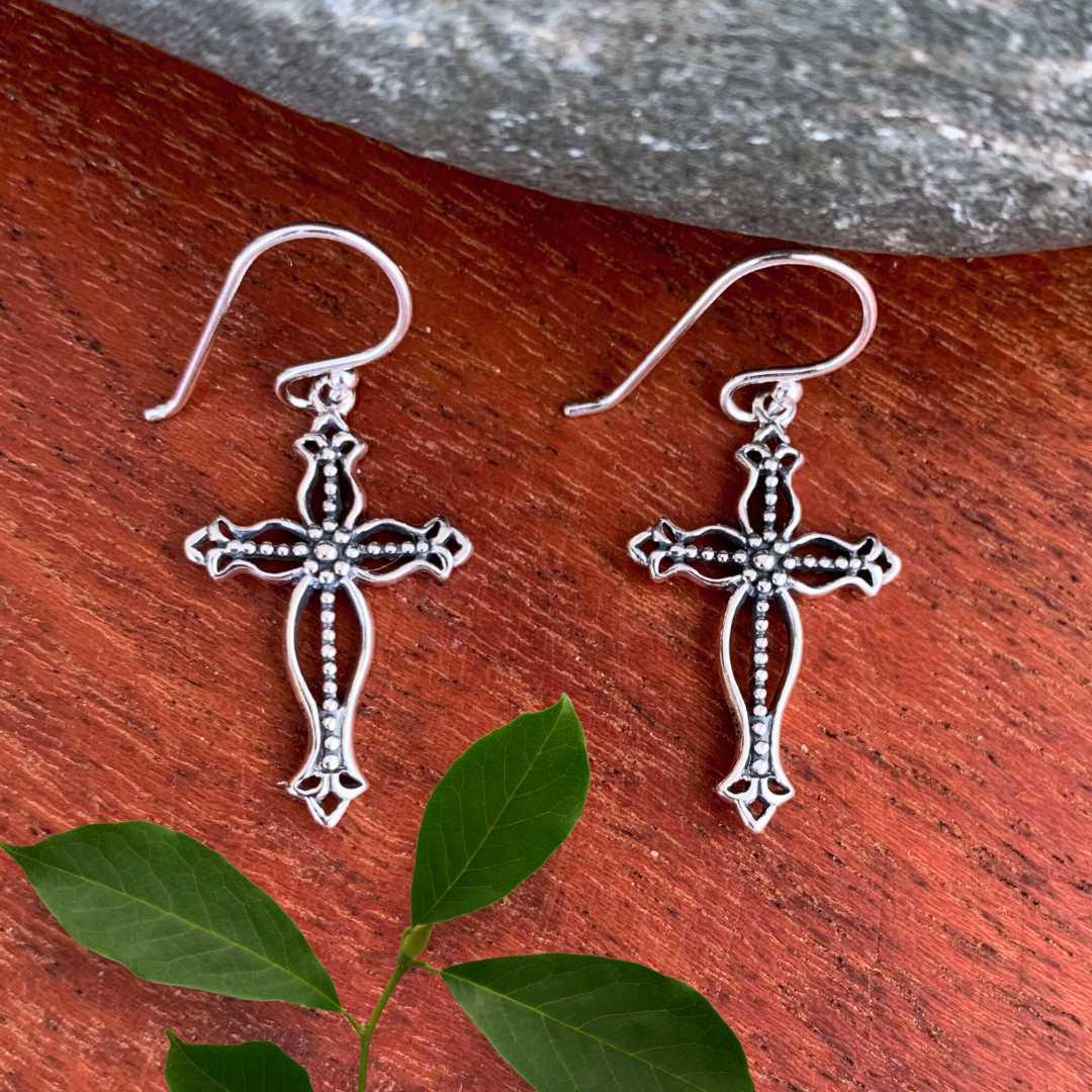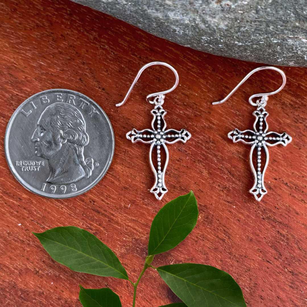 Our Sterling Silver Open Beaded Cross Earrings feature an elegant open cross design accented with delicate bead detailing. Crafted in oxidized sterling silver, these dangle earrings offer a graceful blend of faith and style, perfect for everyday wear or special occasions.